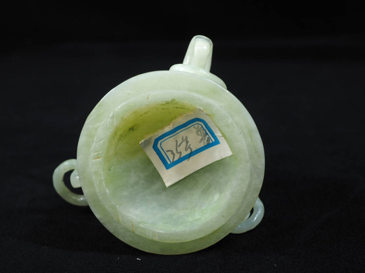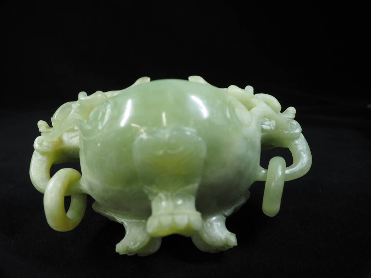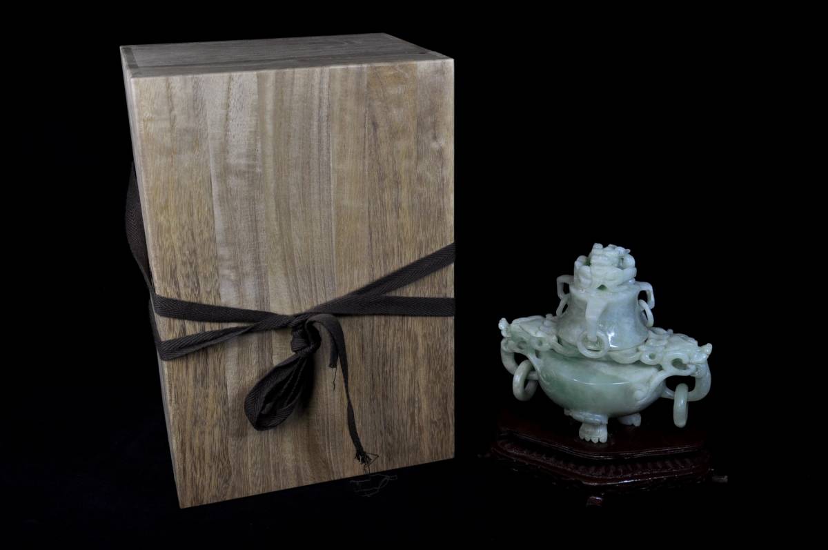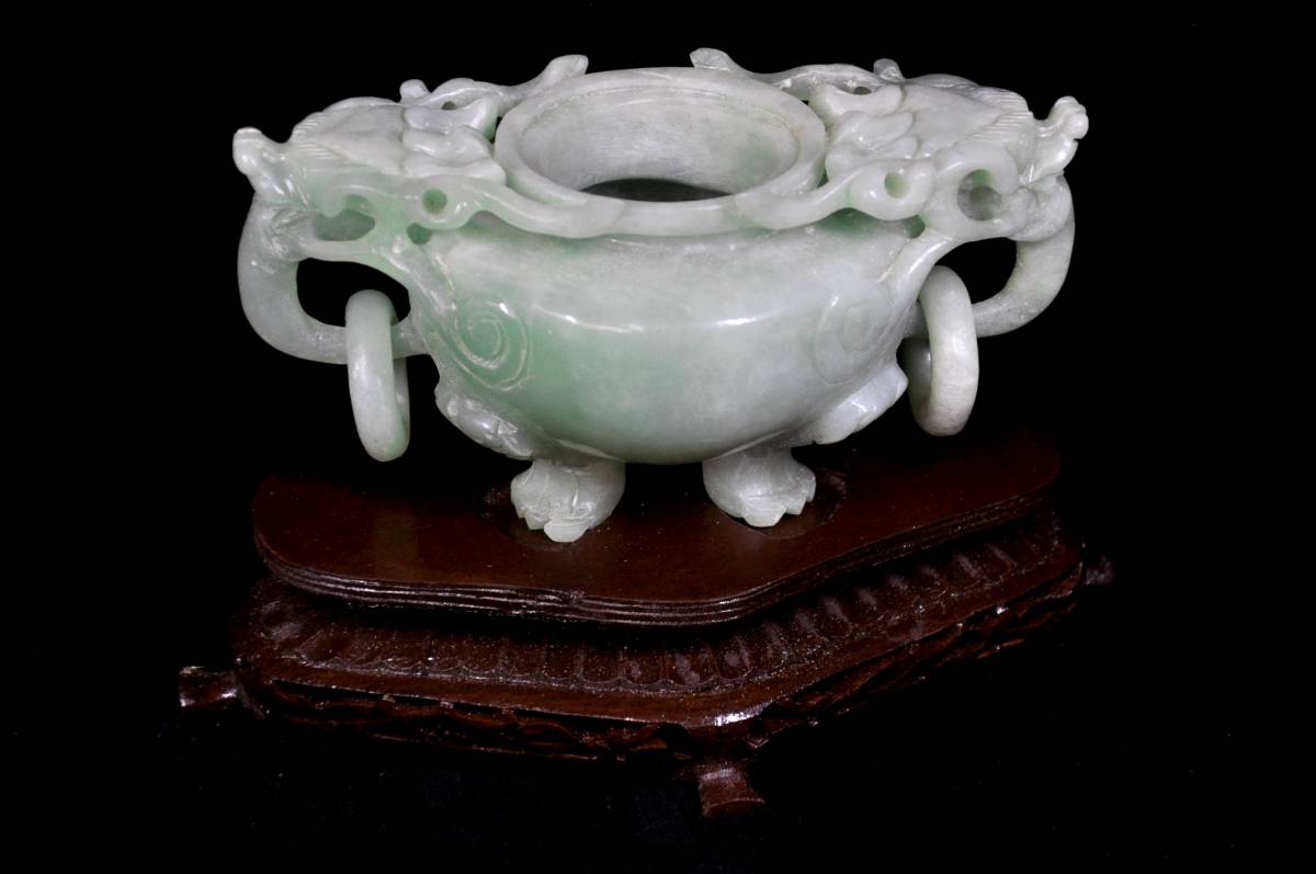 ・古美術 中国古玩 龍頭香炉 翡翠 透彫 木台付き 未使用品
