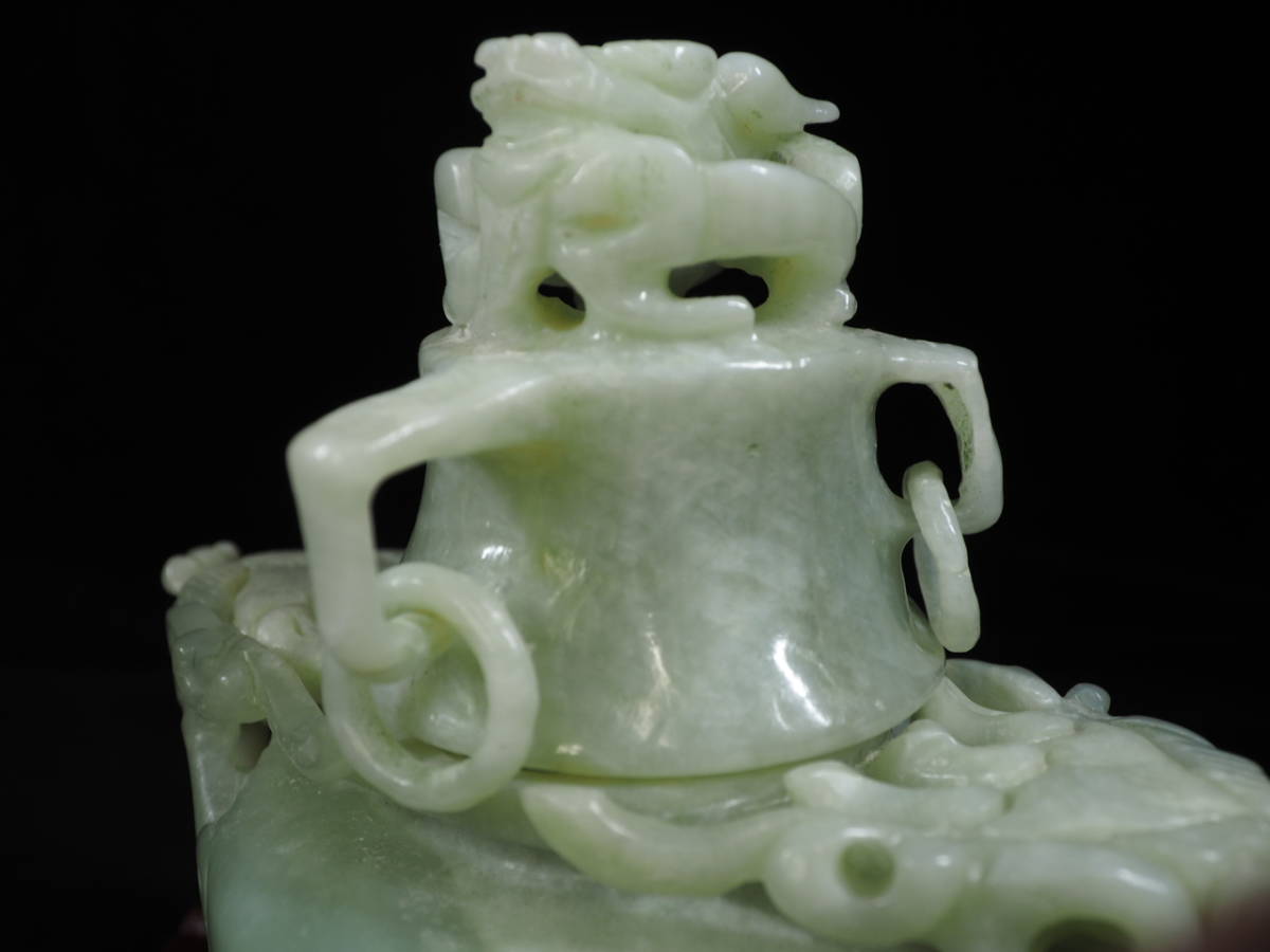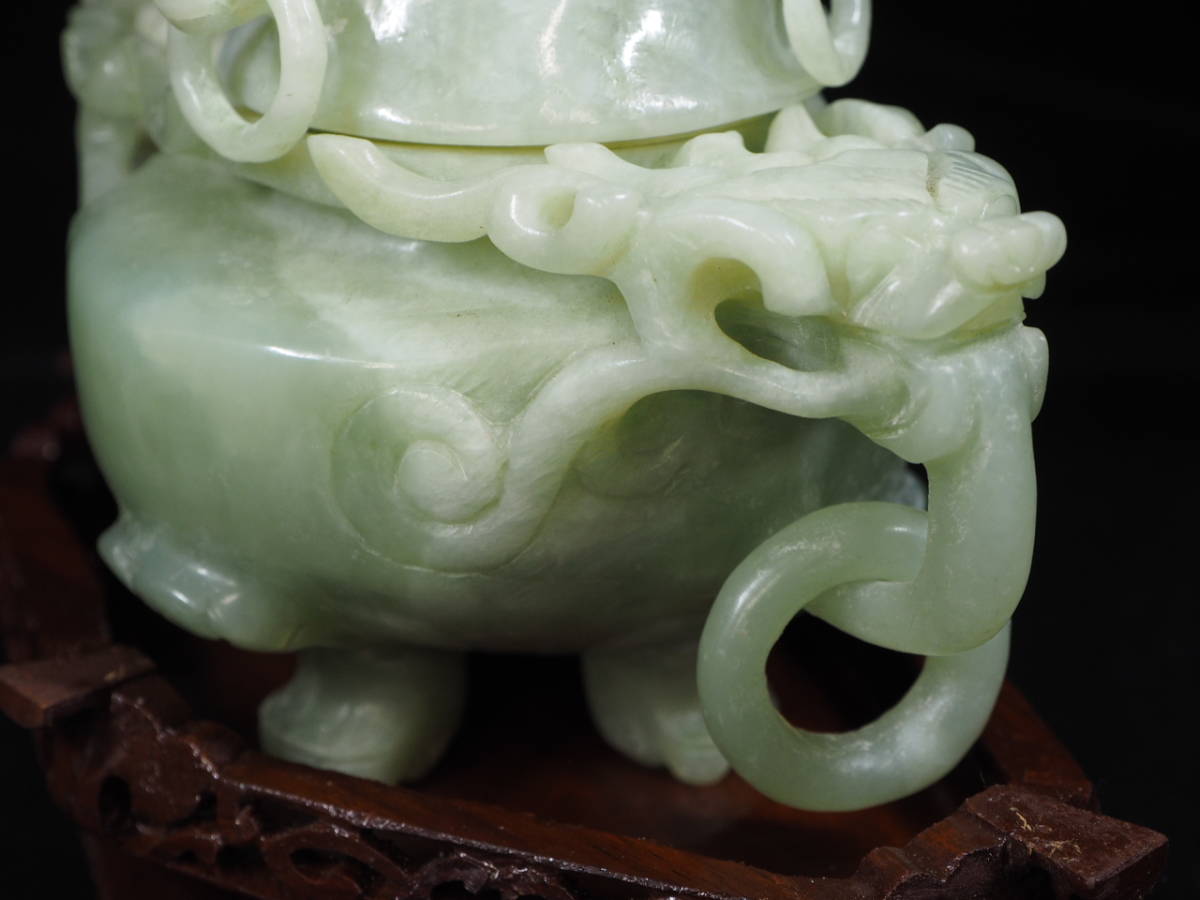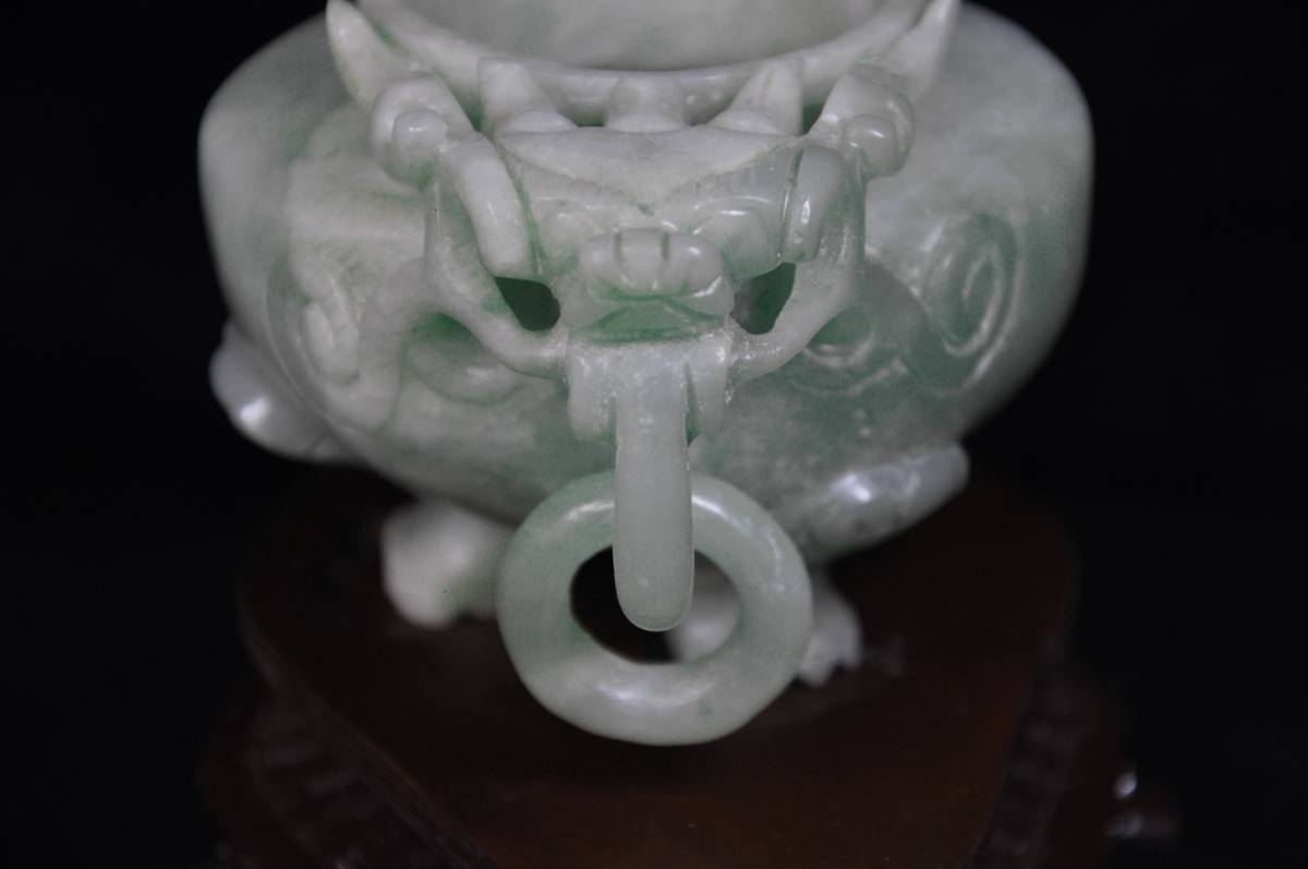 古美術 中国古玩 未使用 龍頭香炉 翡翠 透彫 木台付き 厄除けや幸運を運ぶと言われる縁起のいい翡翠を 手彫りで彫刻した貴重な逸品!TKM412
