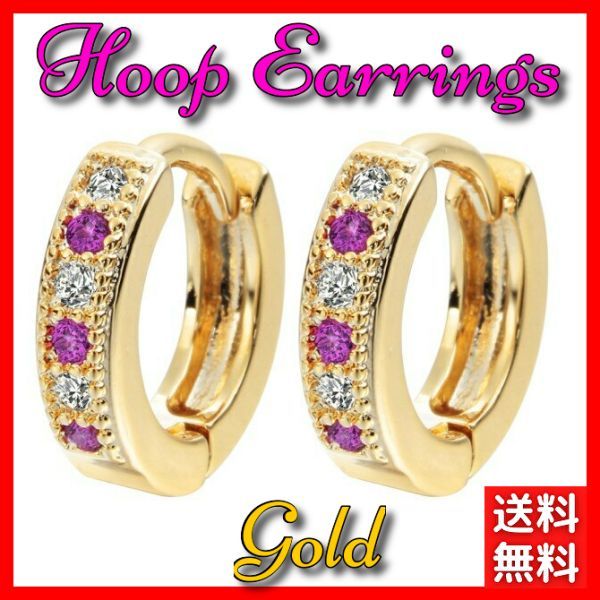 ピアス ゴールド フープ シンプル 小ぶり cz パープル レディース 韓国 ノーブランド クリア キュービックジルコニア 女性 セクシー 大人 綺麗 ジュエリー
