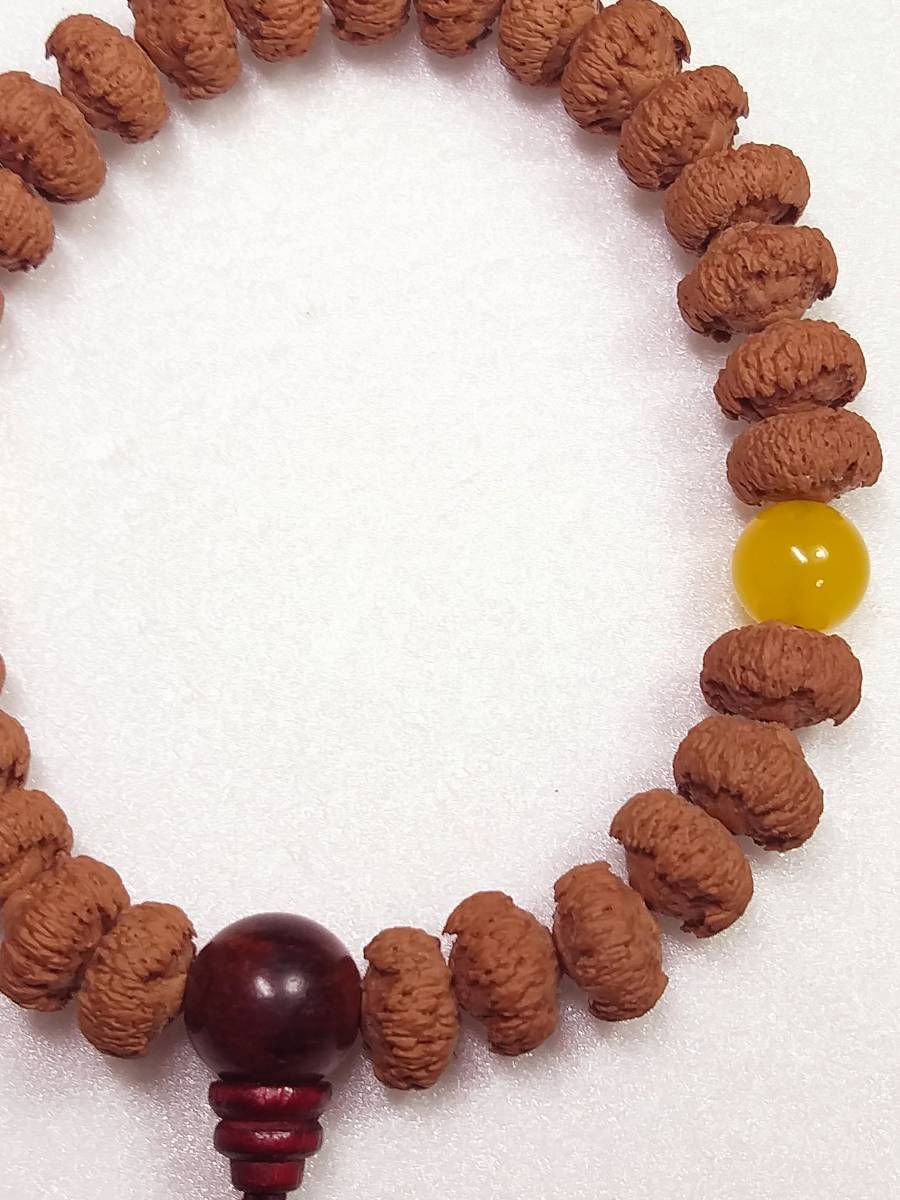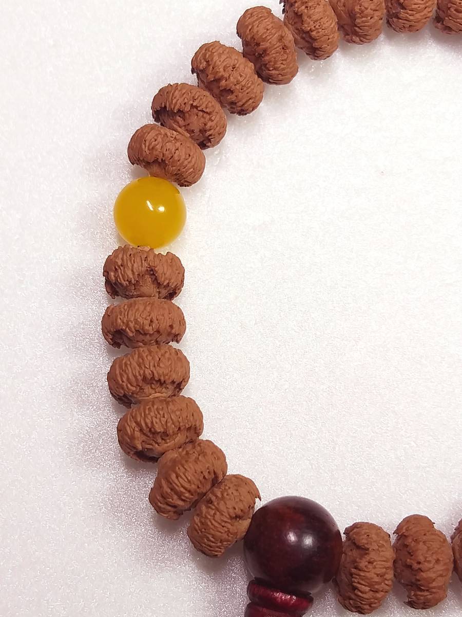 現在出品に使用の極珍品インド野生蓮華菩提の特徴は:①油性が、非常に良質で、②密度が最も高く、硬度が高く、成長速度が非常に遅くです。”鉄粒”と呼ばれております。石のように硬いです。③色合いが、極上の純正な赤茶色です。④重厚感が充分あります。水に入れると沈んでしまいます。⑤木紋紋理は、非常に綺麗です。⑥この腕輪念珠は玉全部で主玉になっており、色に差はありません。