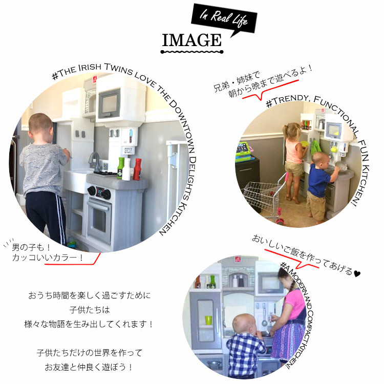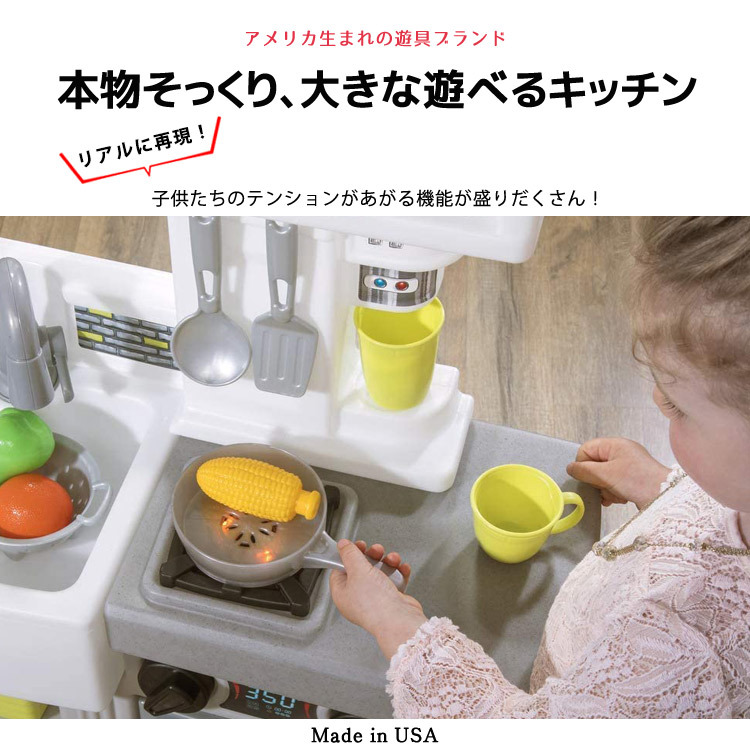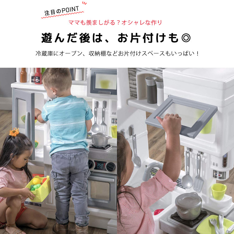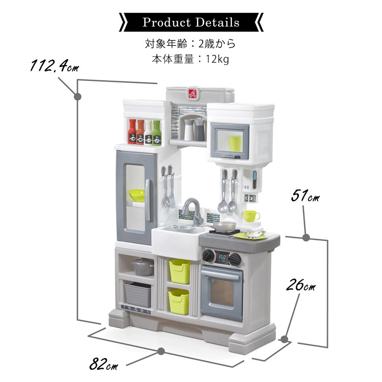 仕様 | 本物を再現!リアルサウンドや光の演出で子供達のテンションもUP お鍋やフライパンを置くと、異なるサウンドとライトアップ! ホワイト×グレーのオシャレなキッチンで 子供部屋からリビングにも!いつでも遊べるキッチン遊具です コンロ、単3電池2本必要(含まれません) |