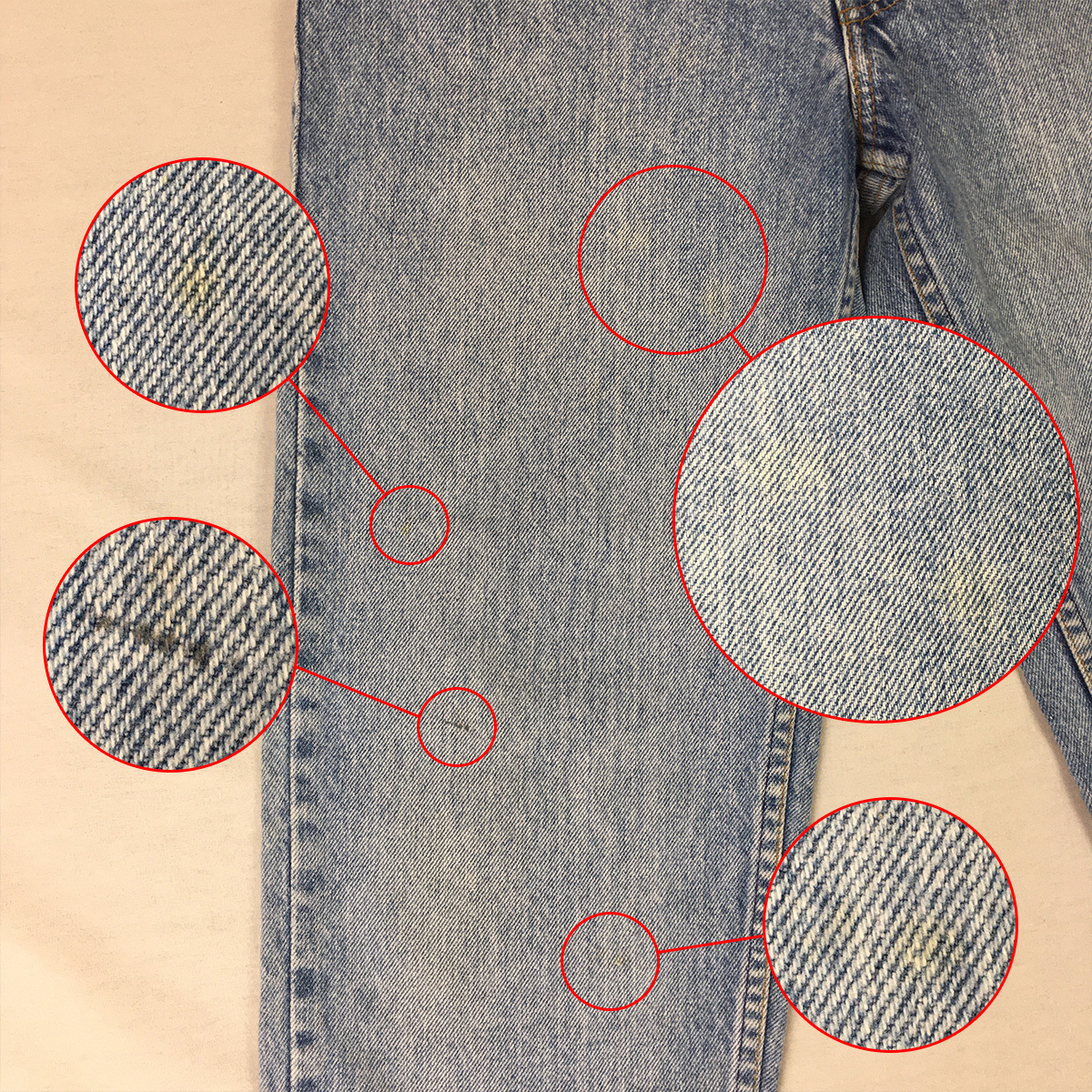 右太ももから膝にかけて四か所薄いシミと汚れがあります。