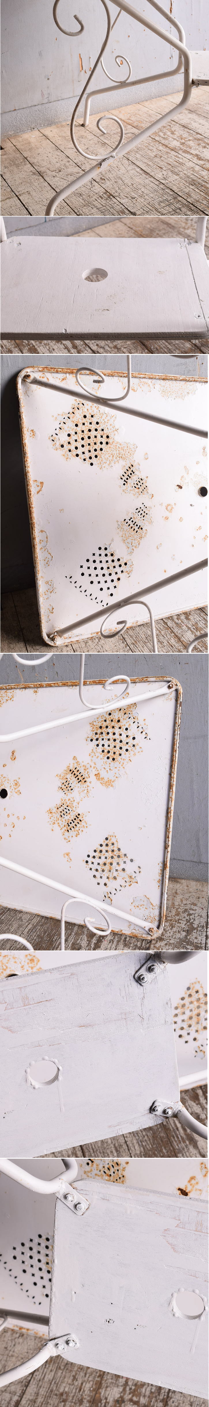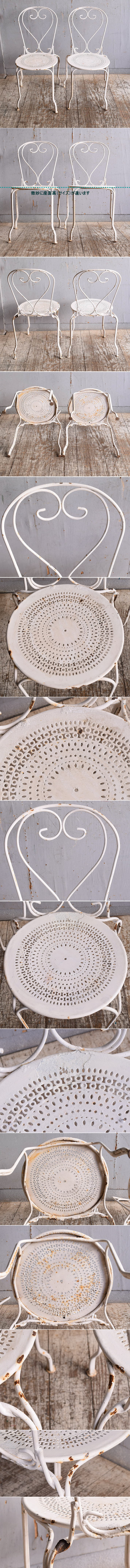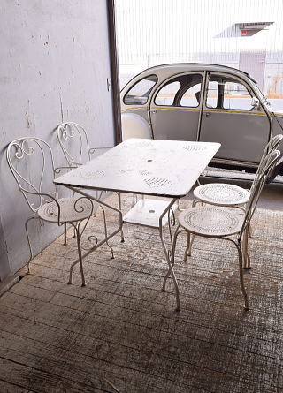 イギリスの蚤の市で見つけてきた古い フレンチ アイアン ガーデンテーブルとガーデンチェア4脚のセットです。 シンプルデザインで、機能的です。 お庭のアクセントにドウゾ   天板、座面は使用感(錆等)、補修跡はありますが、 溶接取れ等なく コンディション良好です。 お花屋さんや雑貨屋さん等ショップディスプレイの アクセントにもオススメです。 大きなダメージ無くコンディション良好です。 商品状態詳細は画像で確認してください。