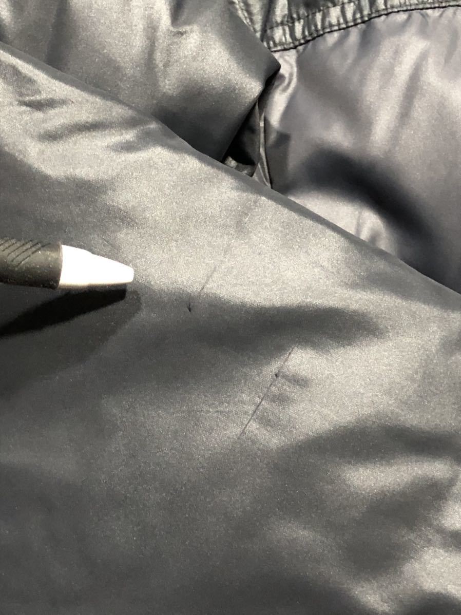 ・右袖前腕(背面側)に細い傷があり、似た傷が他の場所にもいくつか見られます。