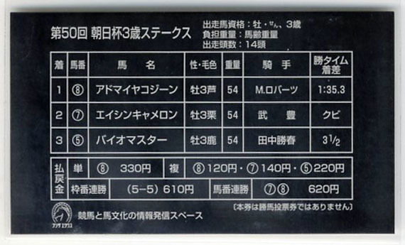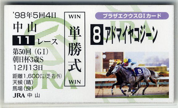 | ★非売品 アドマイヤコジーン 第50回朝日杯3歳S 単勝馬券型 カード JRA プラザエクウスG1カード M.ロバーツ 写真 画像 競馬カード 即決 | |