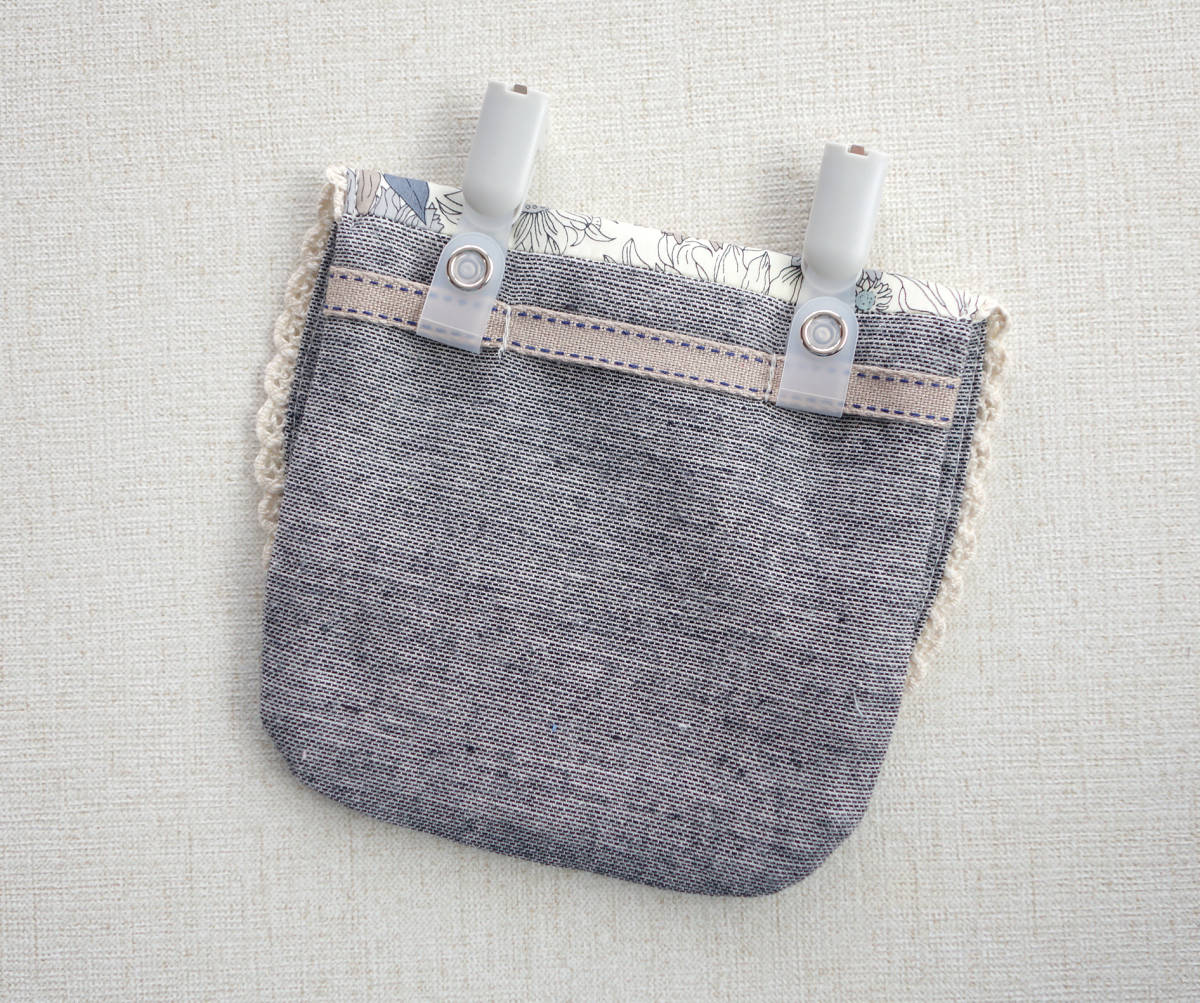 リバティプリントのタナローン(スモールスザンナ・グレー系)とブラックミックスのコットンリネンで移動ポケットを作りました。