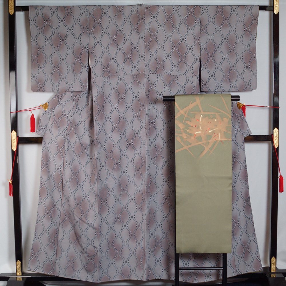 | サイズ | 着物 裄丈:65.5cm 前幅:27cm 後幅:30.5cm 袖丈:49.5cm 身丈:157cm 帯 長さ:377cm 幅:30.5cm ご身長目安152~157cm位の方向け、少し前幅が広めです。 (身丈は背からの寸法です) |