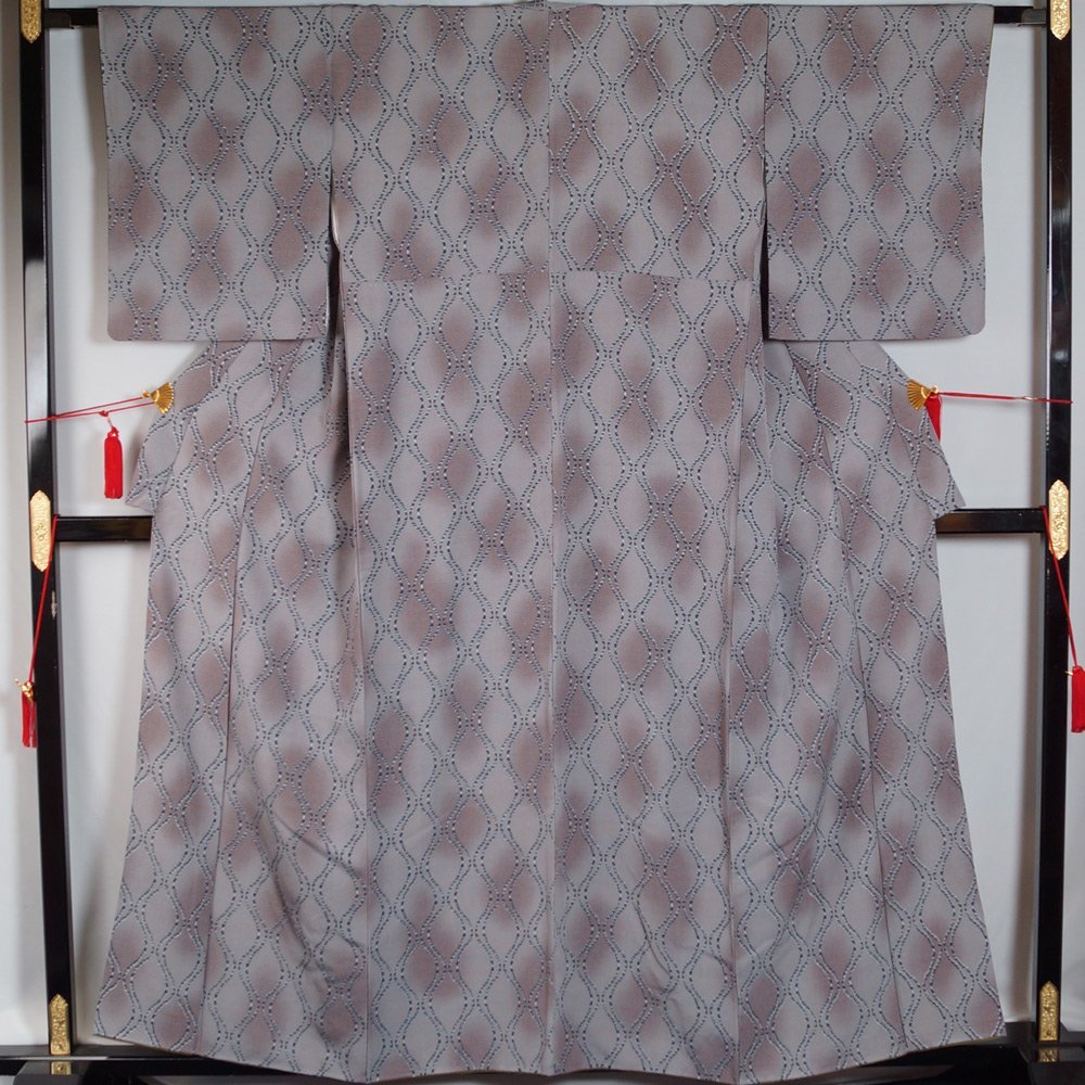 | 商品説明 | 白鼠色系のちりめん地にぼかしの角通しに立涌模様が染められた小紋と、 渋めの柳色系の地に抽象的な枝花模様が染められた塩瀬名古屋帯の2点セットです。 ※着物:八掛裾に少し染め難があります。 帯:垂れ先に薄い輪ジミ、帯端に若干の色ヤケ、塩瀬特有の染ムラが少々あります。 |