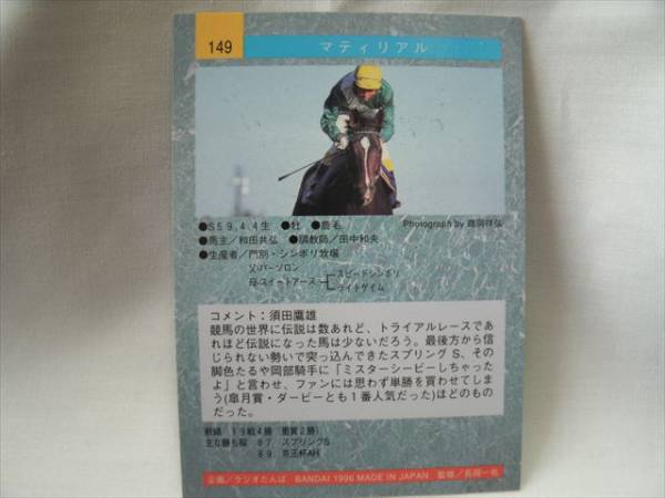 ☆☆☆商品説明☆☆☆ 【メーカー】 バンダイ 【シリーズ】 96年上半期サラブレッドカード 【番号】 149 マティリアル 【種類】 レトロスペクション 【数量】 1枚 サラブレッドカードの第2弾96年上半期カードになります。 |
