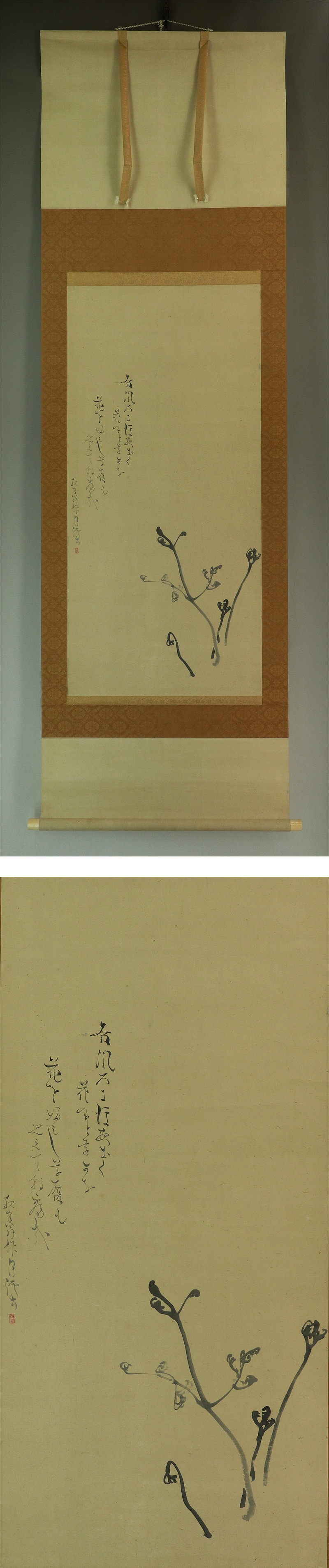 松村呉春 まつむら-ごしゅん(1752-1811) 画家。四条風の開祖。名豊昌・春・月渓、字伯望。称嘉右衛門・文蔵。 壮年の頃呉服村酒造家に寓し、呉春と改め大西酔月を師として、のち蕪村について 画を修め俳諧をよくする。蕪村の歿後は応挙の画を好み弟子にと請うが応挙は固く辞し、 親友として画学を研究し写生を勉強して終に一家をなす。 文化8年(1811)歿、60余才。 本紙は、軽い染み、折れ、皺、虫食があります。 表装は、染み、汚れ、折れ、皺、くすみがあります。 【サイズ】 作品 横約48cm×縦約100cm 表装 横約60cm×縦約196cm |