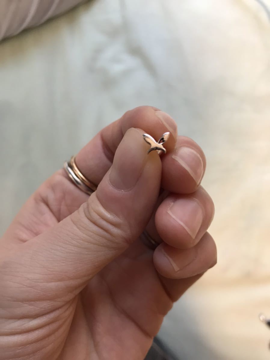 シルバーのバタフライピアスです。サイズは5mm×7mmくらいです。10回ほど身につけました。ハートの穴が開いていてワンポイントになっていて可愛いです。