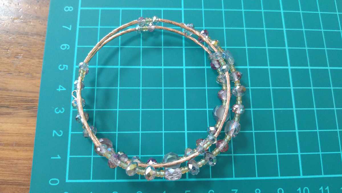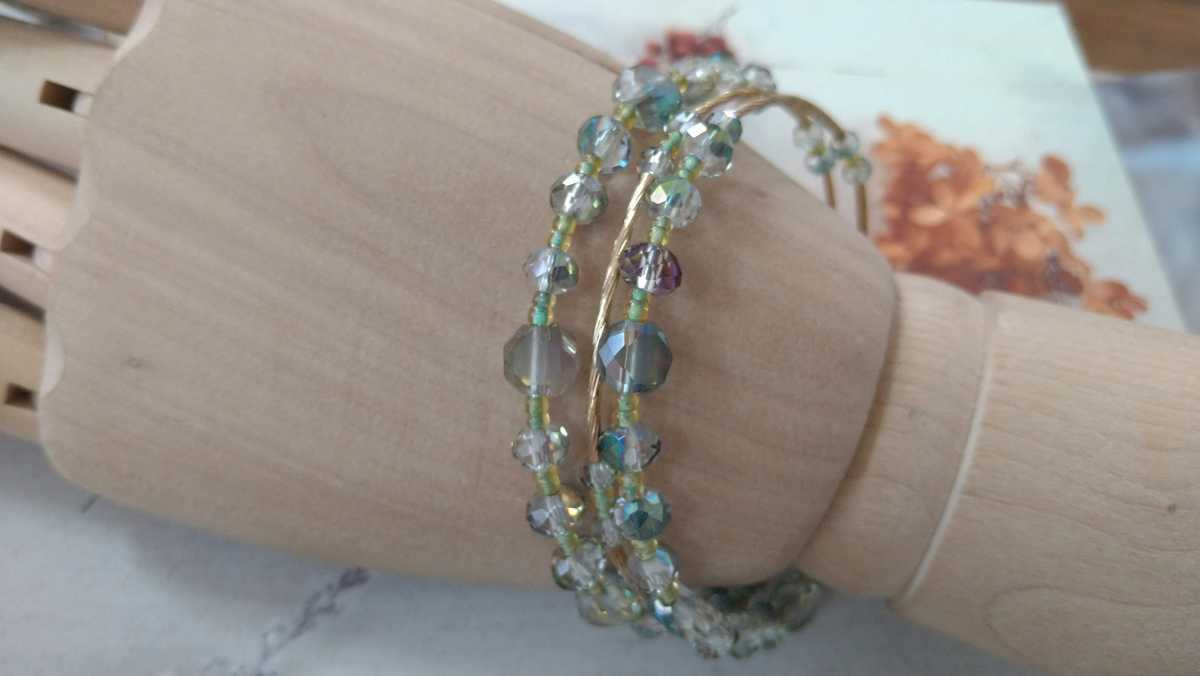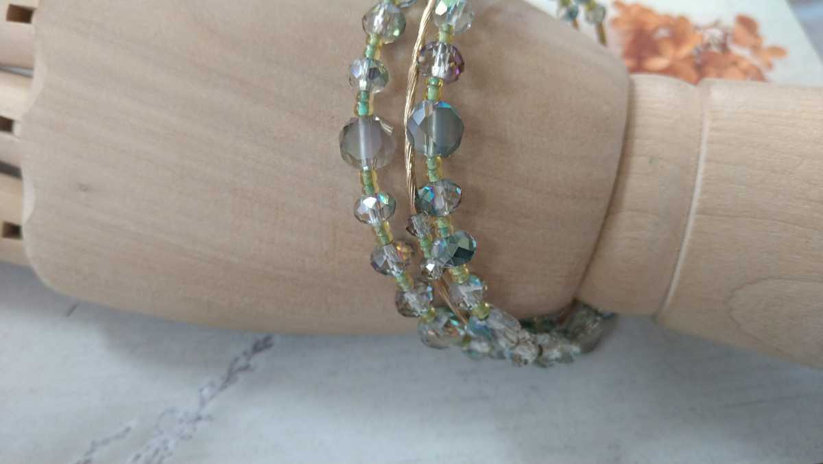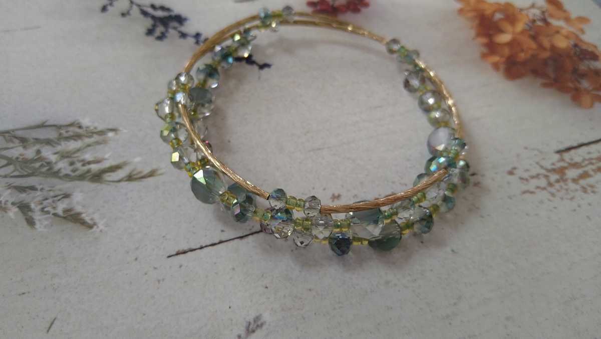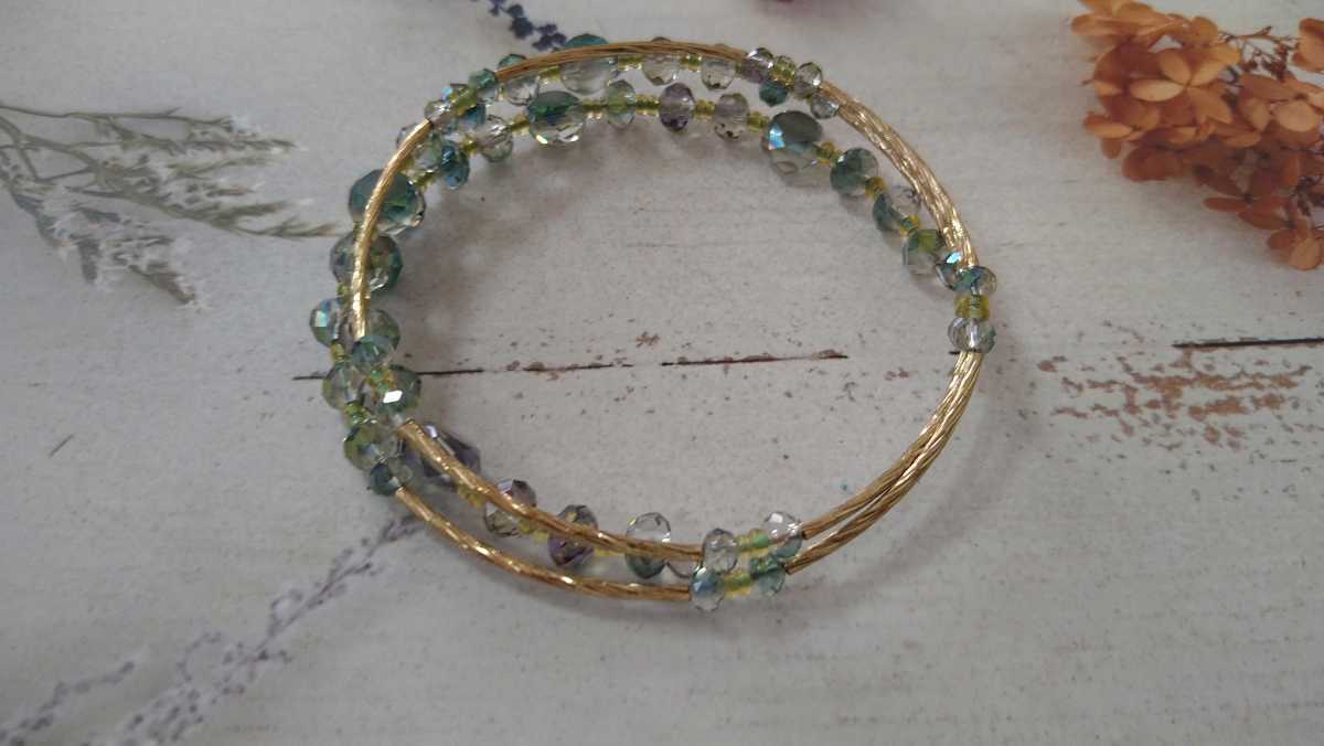 多面カットオーロラカラー×黄緑×ゴールドカラーの3連バングルです