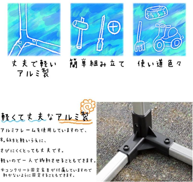 フレーム部分はアルミ使用で錆びにくく丈夫です。
