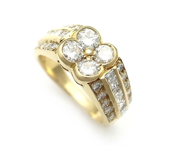 コメント 英国のハイジュエラー「グラフ(GRAFF)」。ダイヤモンド4石で模られたフラワーモチーフ。両サイドのアームにはラウンドブリリアントカットとスクエアカットのダイヤ計3列が施された気品溢れるリング。1.41・K18刻印あり。Graffのff刻印が消えていますが(画像参照)商品に間違いはございません。総重量6.2g