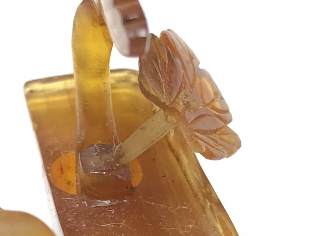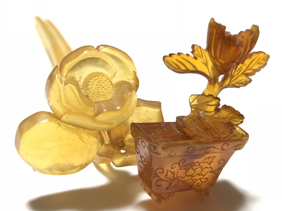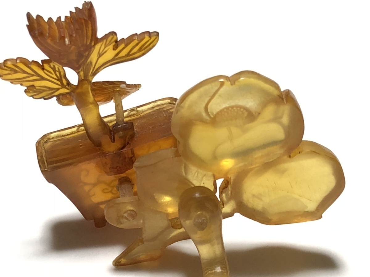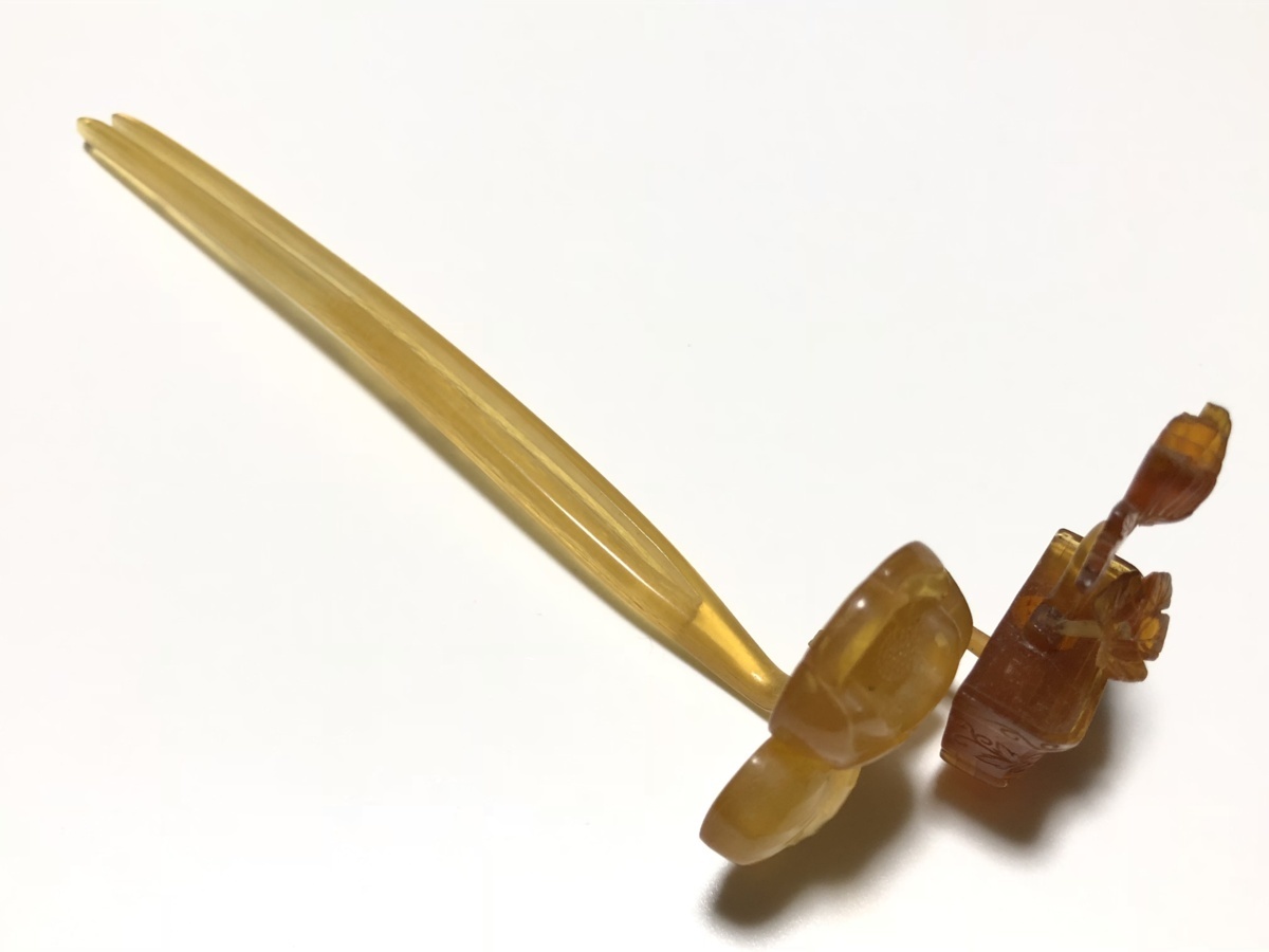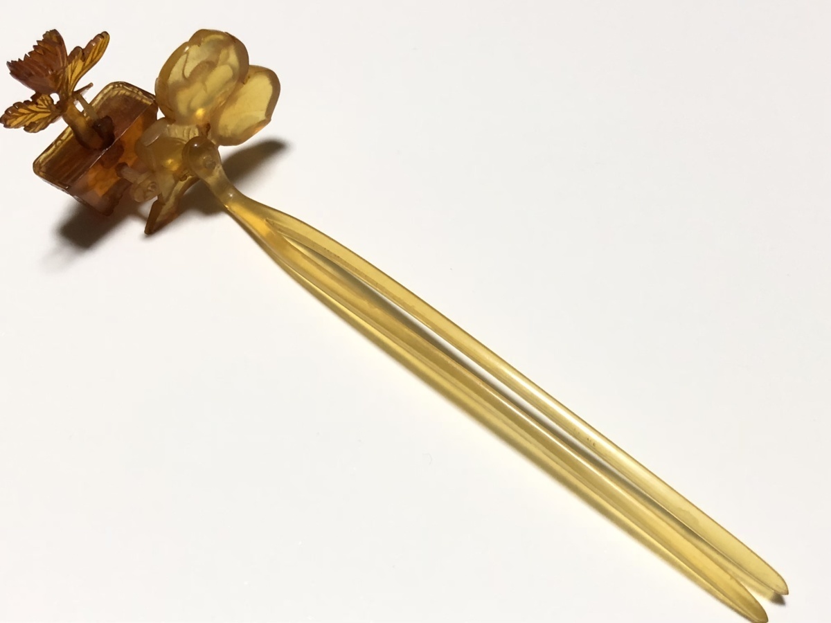 アンティークの白甲の本牛甲を使用した、立体椿植木細工の簪です。植木の葉先に小さな欠け、虫食いが1ヵ所あります。 長さ14.5㎝、幅4.3㎝、重さ12.3g 立体椿植木細工 縦4.0㎝、横4.7㎝
