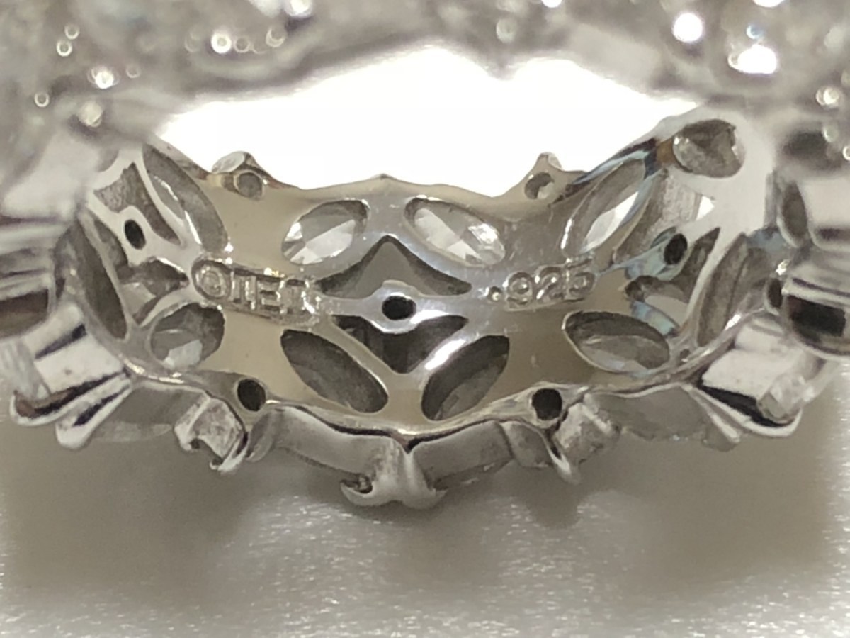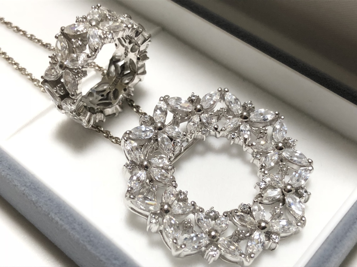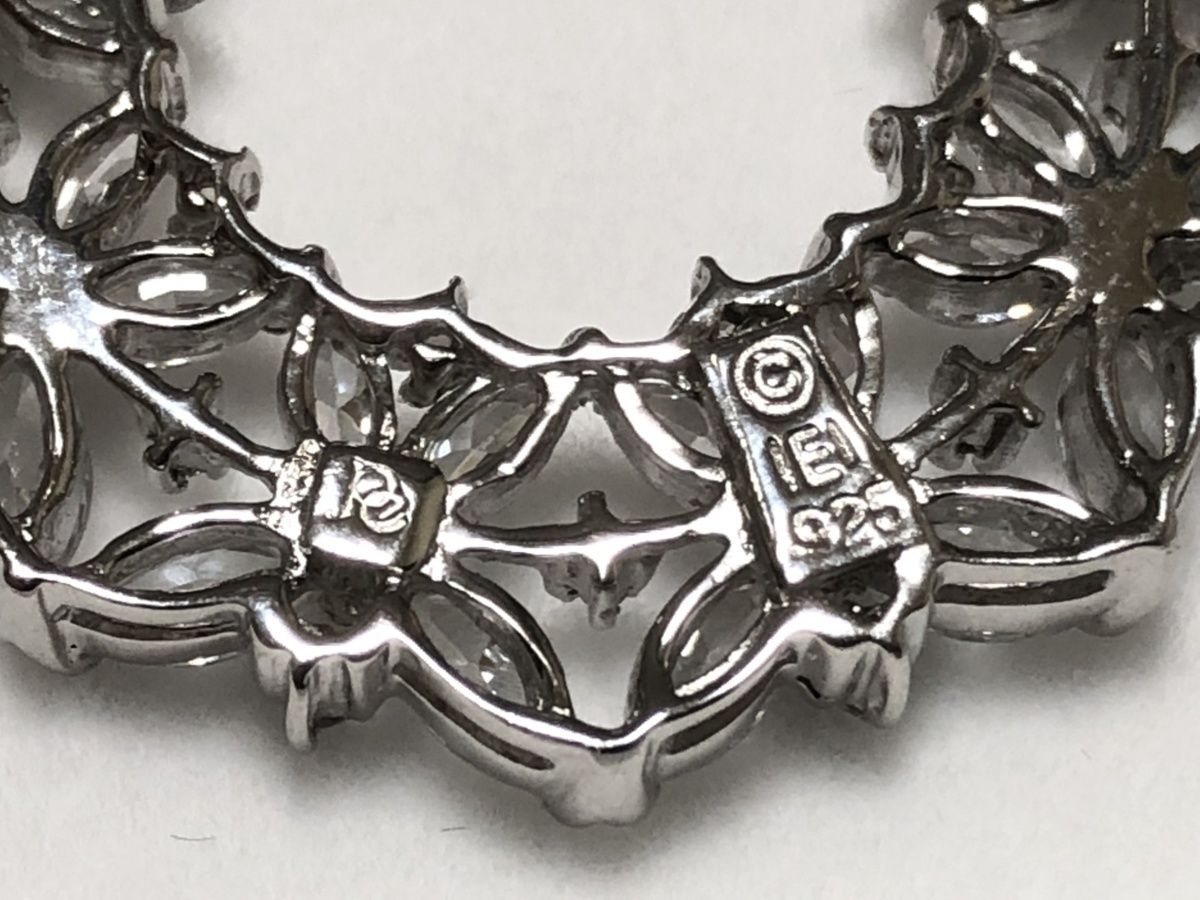 I・E・I(インペリアル・エンタープライズ株式会社)のダイヤモンド、ジルコニア、SILVER925を使用した、リーフサークルデザインのブローチ兼ペンダントネックレス&リングです。デザイナー、ピーター・イードルソンの【Pe】の刻印がブローチ兼ペンダントトップにあります。チェーン、ブローチ兼ペンダントトップ、リングにそれぞれ【925】の刻印があります。ブローチ兼ペンダントトップの針を収める部分の中パーツが欠損している為針部分が外れてしまう為【難あり】表示です。リングは美品です。