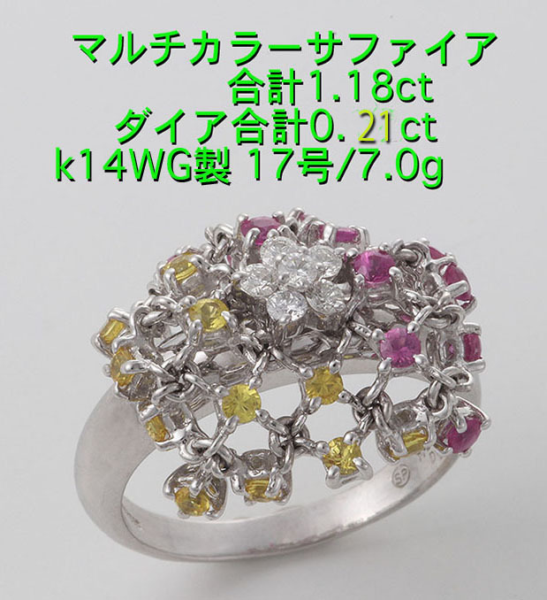 マテリアル | 天然ダイア合計0.21カラット(カラット刻印あり)、天然サフィア合計1.18カラット(カラット刻印あり)、14kホワイトゴールド製 |