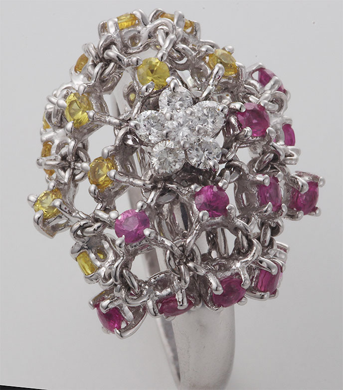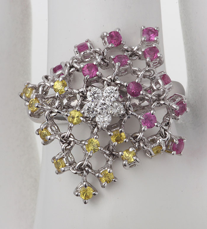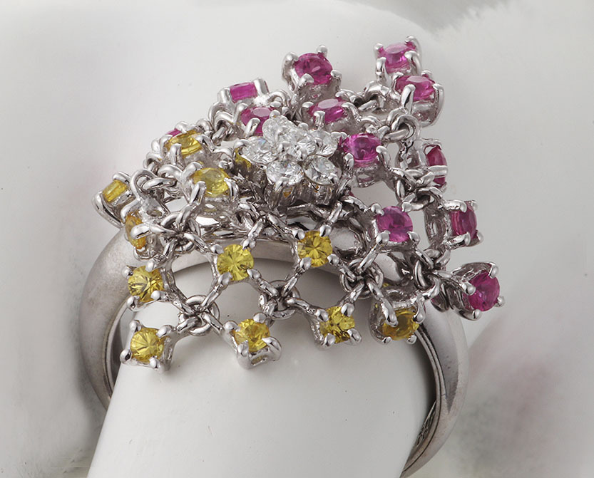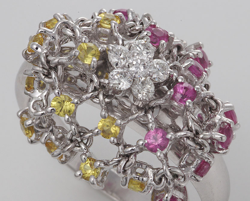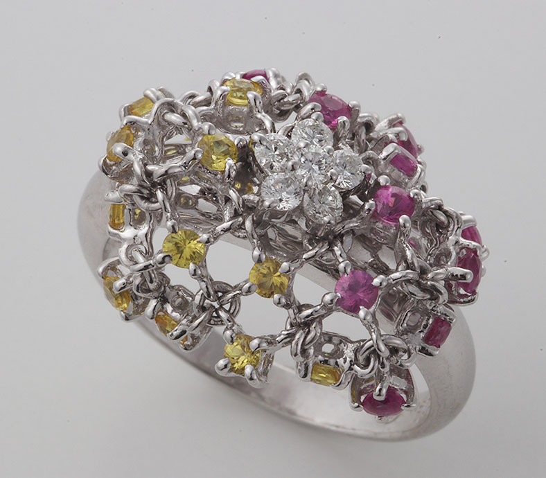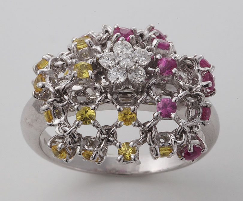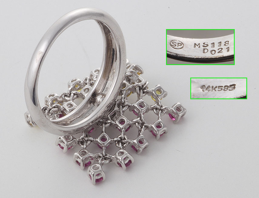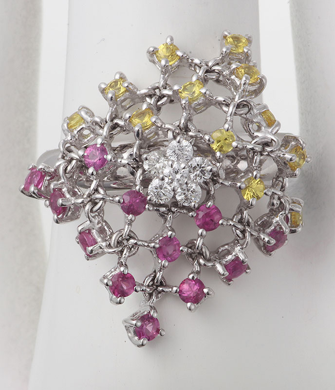 コメント | [[全ての商品に品質保証カードが付きますのでご安心ください]] センターにあるダイアが合計で021カラット、他はすべてサファイアです。 宝石を連結が固定されておらず、指に装着したときは左右部分が指にそって下がります。それに加えて宝石部分は360度回転します。 写真の7と8を見ていただけると判ると思います。ちょっとポップなイメージもあるユニークで楽しいリングだと思います。 |