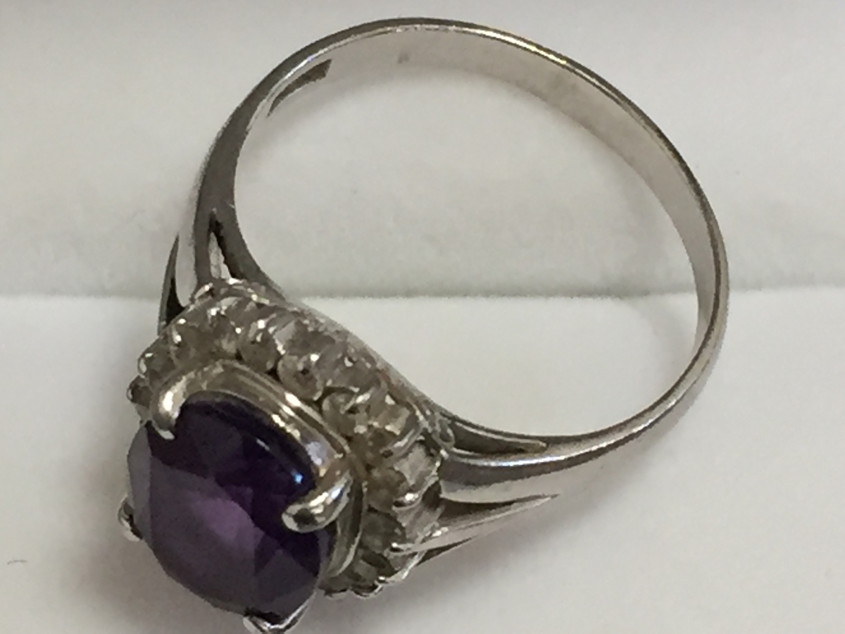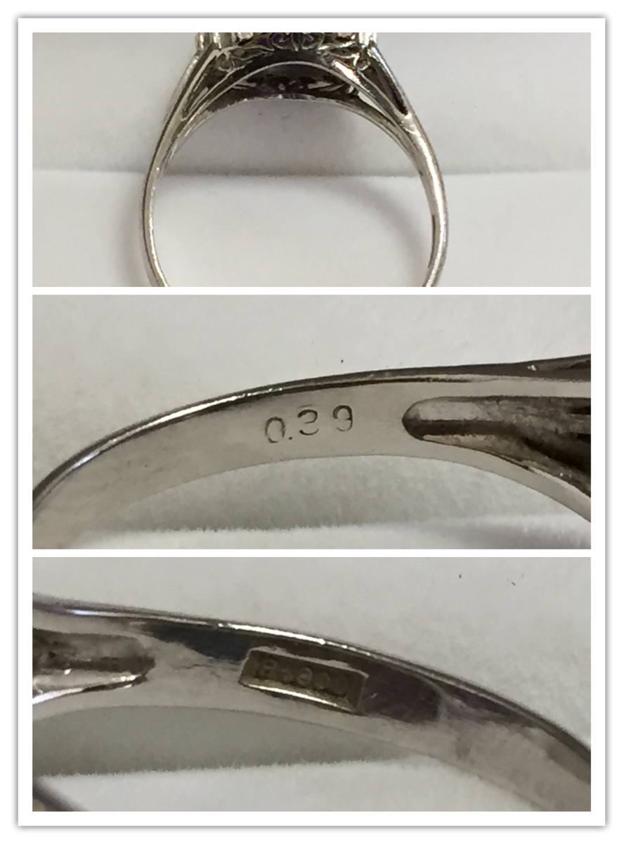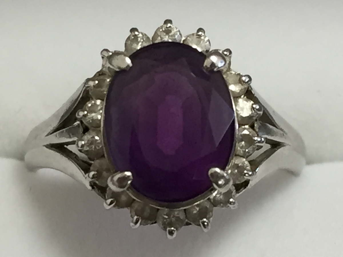 アメジスト、ダイヤモンド(0.39ct)、Pt900を使用した、オーバルブリリアントカットのデザインリングです。【0.39】【Pt900】の刻印があります。 サイズ16号、重さ6.2g アメジスト 縦1.0cm、横0.8cm ダイヤモンド 0.39ct