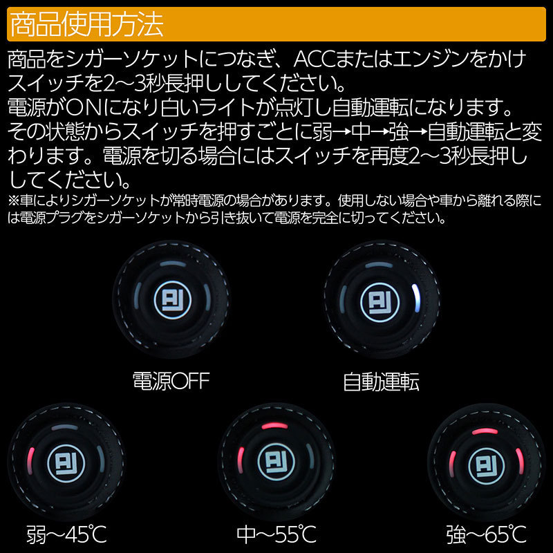 ●商品到着後、早急に商品の確認を行ってください。初期不良が発生した場合、商品到着後7日以内にご連絡ください。送料無料にて交換させていただきます。 ●商品到着後8日以降の返品・交換は、承っておりません。また工賃なども一切負担いたしません。 ※細かい傷や汚れは初期不良対象外です。 ●商品の仕様やデザインは、予告なく変更される場合があります。 ●当商品は海外製品です。まれに若干の傷や汚れ等がある場合があります。いずれの場合も返品・交換は承っておりません。 ●長時間の使用は低温やけどの原因となります。皮膚の弱い方、乳幼児、お年寄り、体の不自由な方、疲労の激しい方などは、注意して使用してください。 ●シートヒーターに布団や毛布をのせて使用しないでください。加熱しすぎる恐れがあります。 ●シートヒーターを小さく折りたたまないでください。破損の恐れがあります。 ●車から離れるときはシートヒーターの電源を切り、シガーソケットから抜いておいてください。バッテリー上がりの原因となる可能性があります。 ●シートヒーターを水洗いしないでください。破損の原因となります。清掃する場合は固く絞った布などで、表面を拭いてください。 |