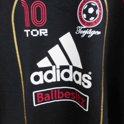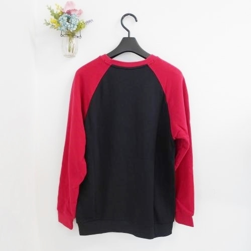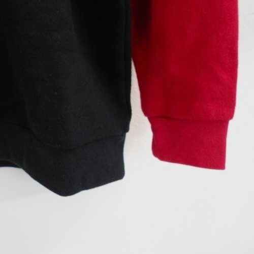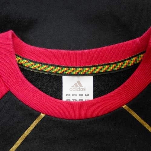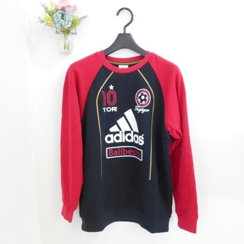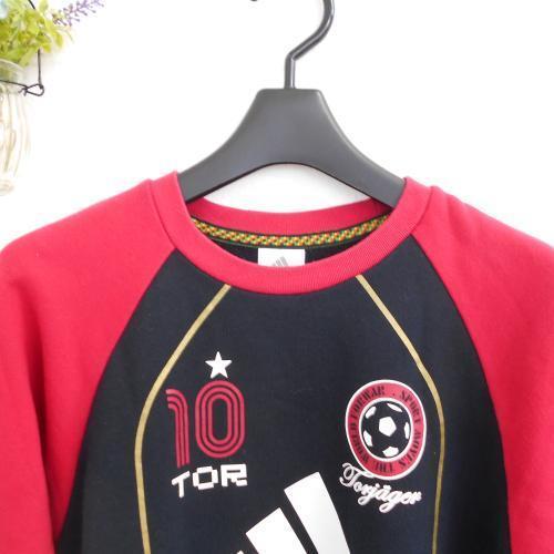 アディダス adidas キッズ ジュニアサイズの長袖スエット地のトレーナーです。 お色は黒・ブラック×赤・レッドに前のプリントが映える一品です。