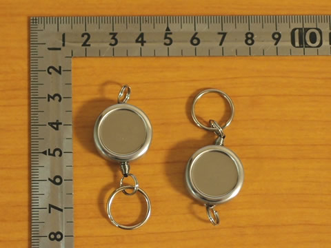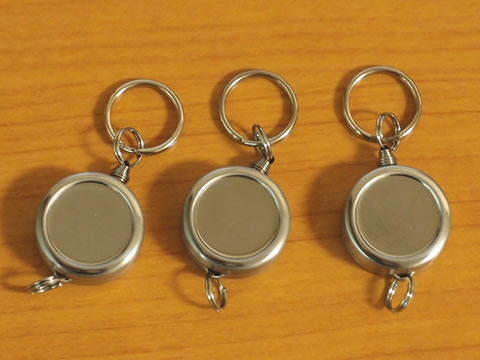 ステンレス製の本体で、しっかりとした紐がセットされた【リールキー(リールホルダー) ステンレス本体 + 強力紐タイプ 3個セット】です。