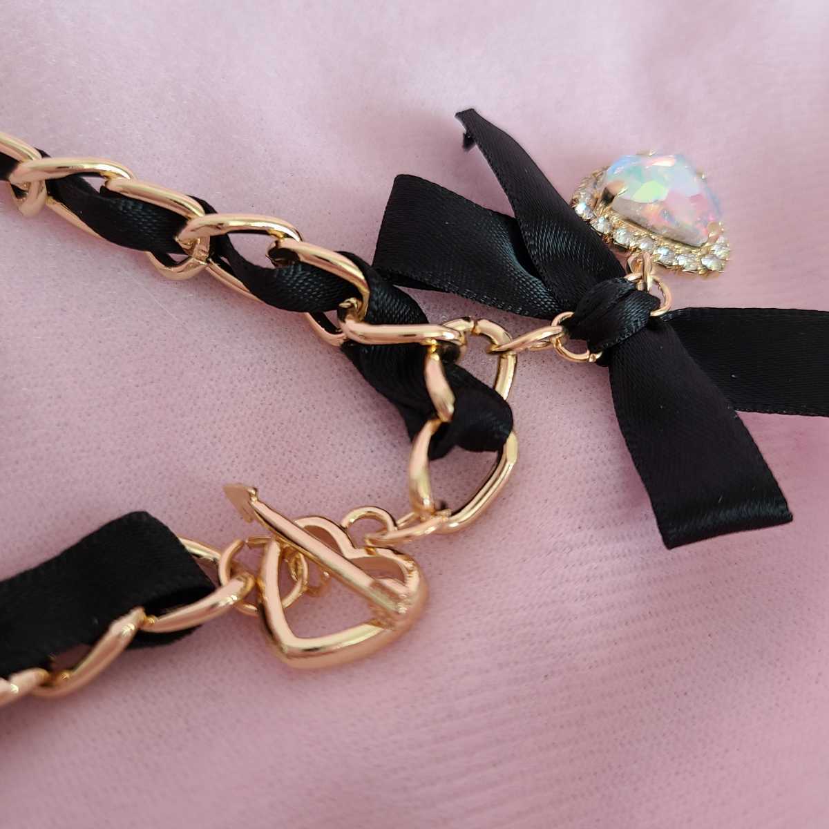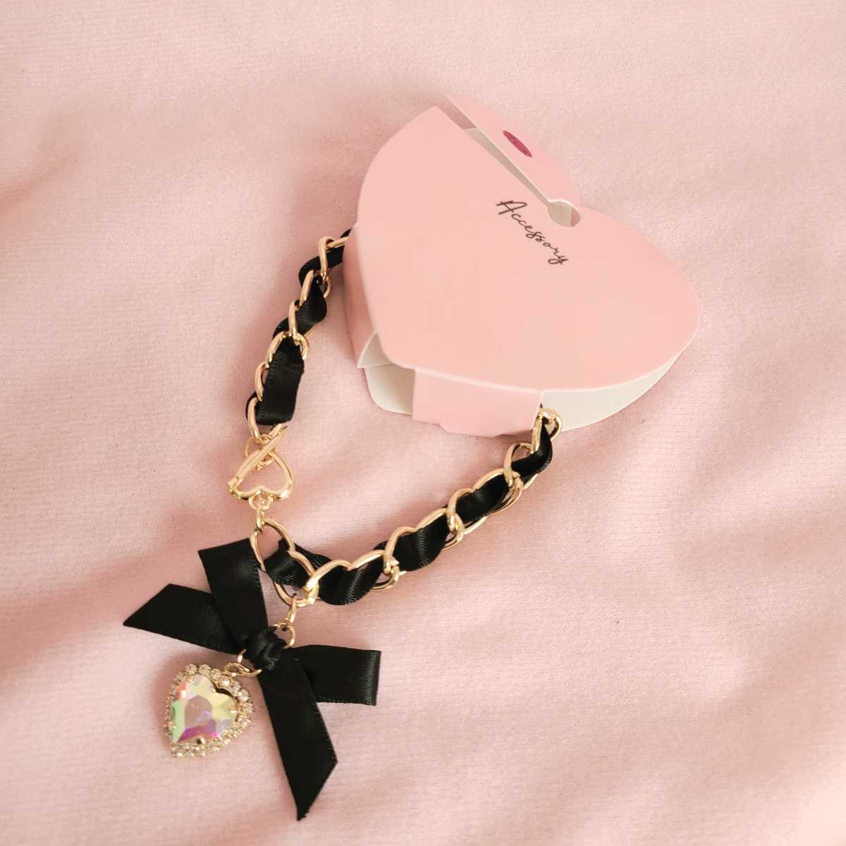 ★★★量産型 リボンチェーン ハートストーン ダイヤモンド風 ブレスレット キューピット ゴールド 黒 ブラック ロリータ R409-077k