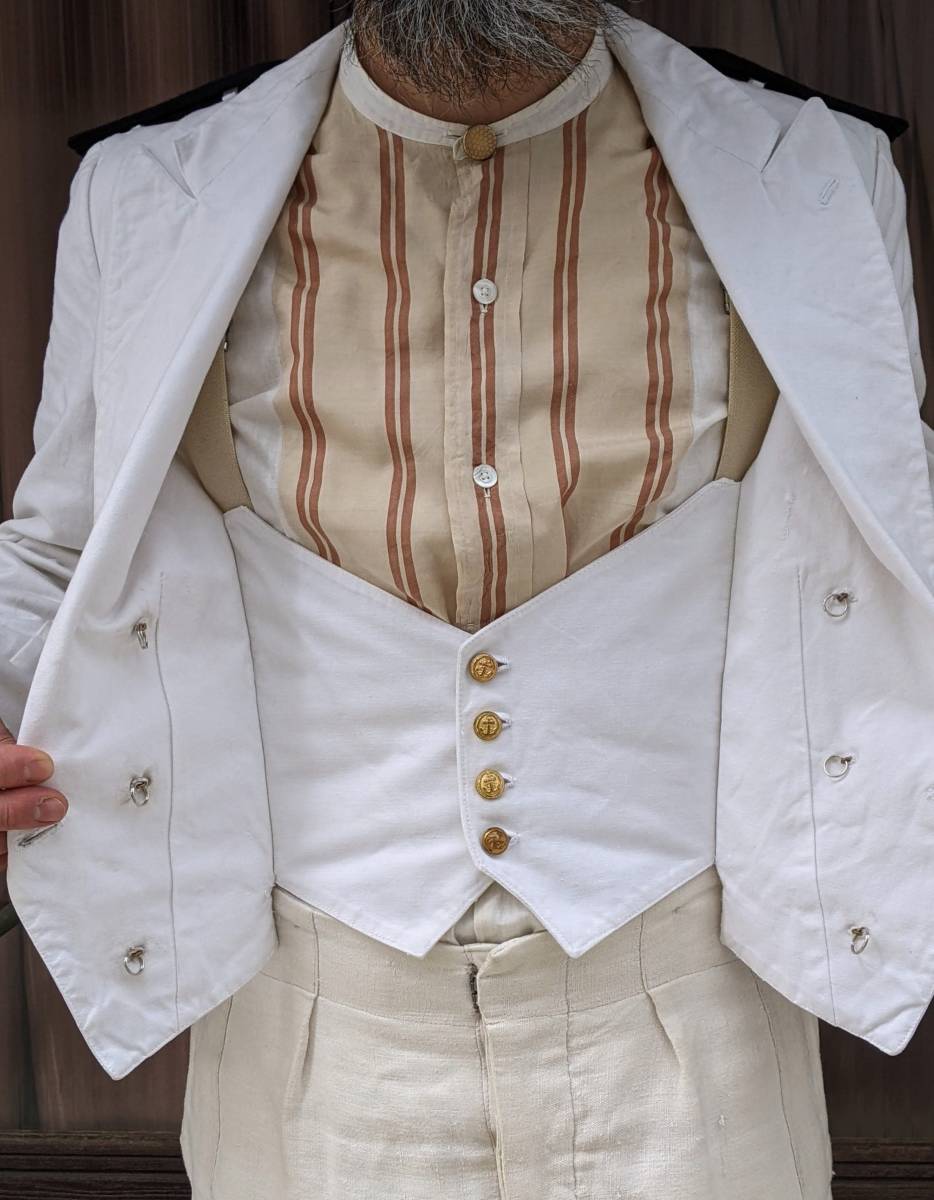 当時の植民地と言えばモロッコなど北アフリカあたりでしょうか、暑い地域ではコットン素材の燕尾のないデザインが風土に適していたのでしょう