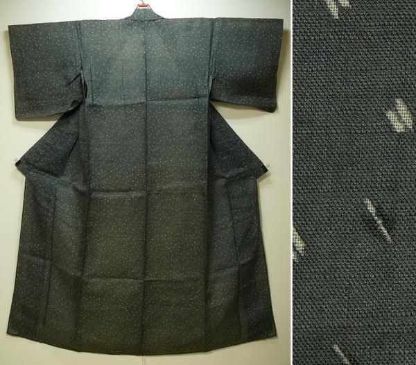 素材:麻。着丈152cm、裄59.5cm、袖幅31.5cm、袖丈41.5cm、前幅21cm、後幅29cm。裄約1cm伸びます。衿、両肩山、袖山がやけています。左前袖付け、両後ろ袖付けの所がほつれています。左衽の裾から約54cmに1cm、左前身頃の裾から約70cmに1cmと3mmのしみが2個あります。左後ろ袖に1cm、左後ろ身頃の裾から約35cmに3cmの薄しみと13cmの線のしみがあります。右後ろ身頃の背中に写真の様な5mm×2.5cmのしみがあります。右後ろ身頃の裾から約77cmの所がやけています。
