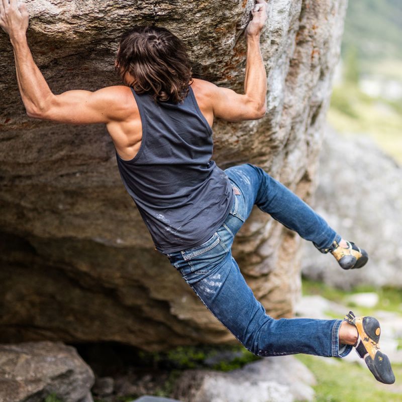 デニム生地でも非常に動きやすく、クライミングを妨げません。
