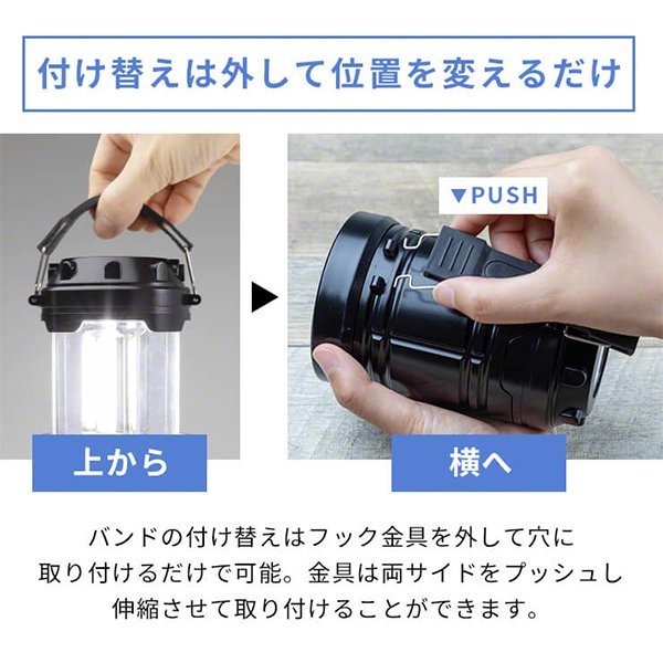 ■持ち手のバンドは横・上へ付け替えが可能です。懐中電灯として使用する場合はバンドを横に取り付けるのがおすすめです。