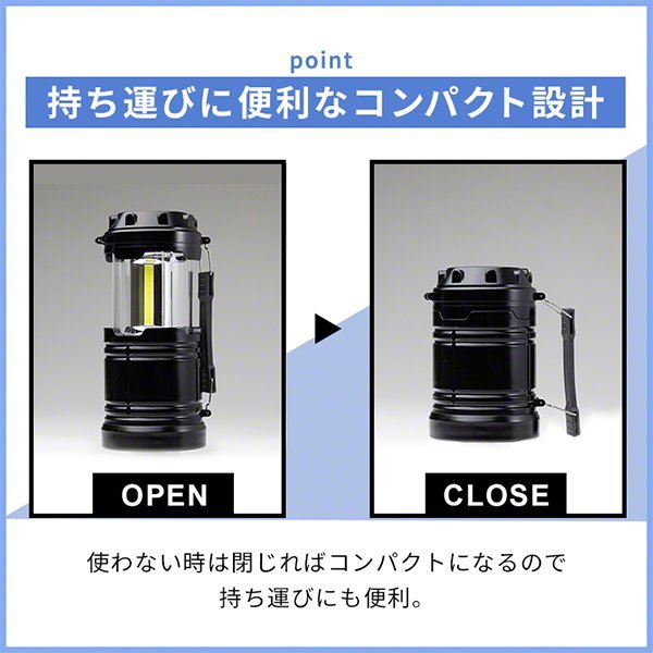 ■ランタンは本体上部を引き上げると自動で点灯。ランタンのみの最大点灯時間は約3時間。閉じれば消灯します。