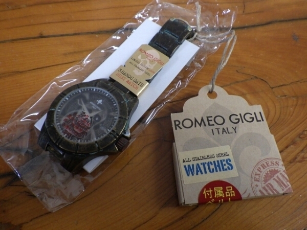 | 商品説明・コメント | ロメオ ジリの腕時計です。 型式はRGM-3210706です。 駆動方法はメンテナンスの楽なクォーツとなります。 新品未使用のデッドストックです。 ロメオ ジリと言われても日本では馴染みが薄いかと思いますがロメオ ジリはは1978年ニューヨークでファッションデザイナーとして活動を始め、1983年自身の名を冠したブランド「ロメオ ジリ」でミラノコレクションにデビューしたファッション界の重鎮です。 世界各国の文化にインスパイアされ独自に作り上げた個性的なデザインは、当時イタリアブランドブームにも恵まれ一躍脚光を浴びる事となり、またその美しい色使いから「色の魔術師」と高く世界から評価されています。 イタリアファッション界の権威であるオッキオ・ドーロ賞の受賞後、1996年、ルイ・ヴィトンのモノグラム生誕100周年記念祝典では、ヴィヴィアン・ウエストウッド、ヘルムート・ラングなどと並びモード界を代表する7人のデザイナーに選ばれ「セブンデザイナーズコレクション」と呼ばれる限定コレクションのデザインを手掛ける事となったのは記憶に新しい処です。 ロメオ ジリのコレクションは扱い店が少ないのでかなりレアなのに加え、このウォッチコレクションは世界限定1000個となりますので更にレアな品物となります。 スカルを大胆にあしらったダイアルデザインで有りながら風防をつや消しガラスとする事で主張し過ぎないデザインとなっております。 時計のブレス、ケースはエイジング処理が施された黄銅の様な風合いです。 写真では撮影して御座いませんが時計のケースは「宝箱」を模した物になっておりトータル的に海賊の宝物の様な素晴らしい時計に仕上がって御座います。 ロメオジリならでは世界観を表現したアーティスティックな時計を是非どうぞ。 ケースサイズは縦が約49mm×横が約42mm×厚さが約10mm程度となります。 腕周りは最小で約150mm~最大で約205mm程度となります。 ケースやブレスははステンレスをエイジングラスタ(錆び)加工した物になります。 風防はミネラルガラスをつや消しにした様な加工がされてます。 当然動作確認は致して御座いますが節電の為、発送時には竜頭を上げた状態で発送致します。 参考上代は16590円では御座いますが今回入荷した物に限りヤフオク特別価格で提供致します。 新品とは言え、廃盤モデルの貴重なデッドストックになりますのでバッテリーの残量は保証致しかねます。 コレクターの方やマニアの方は是非どうぞ。 新品の商品になりますので先ず間違いないかとは思いますが個人出品になりますねで基本的に傷、腐食、汚損、色褪せ、記述との相違点、劣化、不調等、何かしらの欠陥等は有るだろう前提でのジャンク扱いノークレーム、ノーリターンでの取引を希望致します。 上記の通り、原則瑕疵担保責任はお受け致しませんので御了承下さいます様御願い致します。 上記の条件を御理解頂けない方の入札はお断り致します。 商品状態 | E | 注意事項 | ■ご質問がありましたらQ&A若しくはメール迄宜しくお願い致します。 | ■原則、中古ジャンク扱いの認識を頂ける方・極端に神経質で無い方・身勝手で無い方での御入札お願い致します。 ■例外なく汚れ、割れ、劣化、社外品による補修、油脂類切れ、折れ、腐食、破損、欠損、欠品、色褪せ、錆、機能的な欠陥は有るだろう前提でジャンク扱いでオーバーホールベースのノークレーム、ノーリターンでの取引条件とさせて頂きます。 ■入札の際は、商品説明・内容・写真を良く御確認の上、自己責任に於いて御入札下さい。 ■画像の色は写真の撮影状況により現物と異なる場合が御在います。 その旨を了承戴ける方のみの御入札をお待ち致します。 ■オークション終了から3日以内の御連絡頂けない場合は落札者都合にてキャンセルとさせて頂きます。 その際、yahooより自動的に『非常に悪い』の評価が付きますので御了承下さいませ。 ■商品の発送は入金確認後、4~7日のお時間を頂きます。 ■オークション終了から1週間以内の御入金でお願い致します。 ■新規のID方の悪戯入札防止の為、評価の無い新規の方・評価に著しく不安が在る方の御入札はお断り致します。 新規IDの方でどうしても入札したい方は質問欄より購入の意思を示して頂いた上で御入札下さい。 購入の意思を示さず入札頂きました場合は入札取り消しをさせて頂き今後、弊社商品への閲覧・入札は御断り致します。 ■Seller will not ship internationally. |