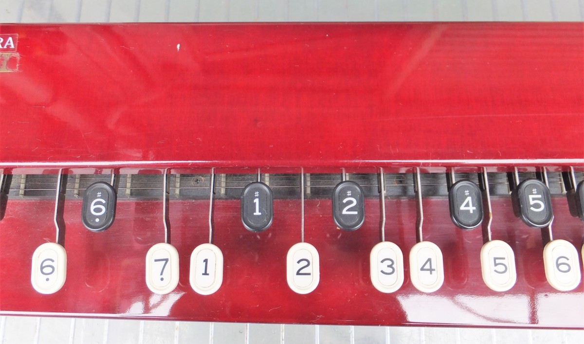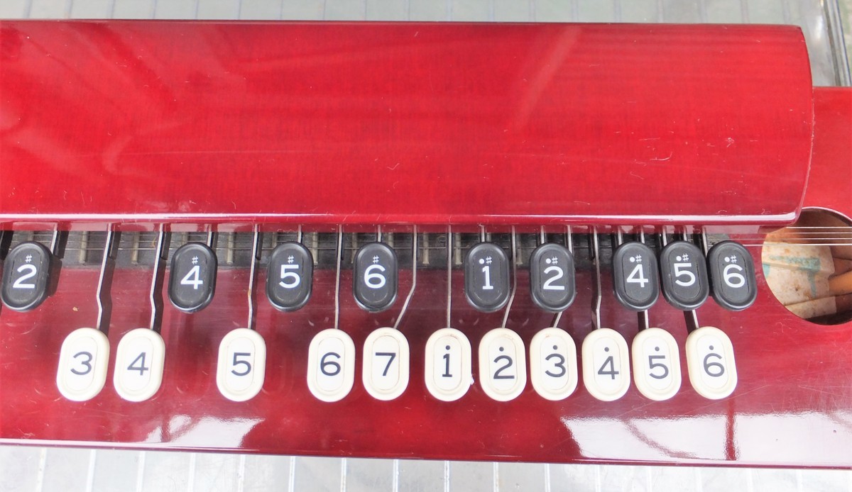 つまり大正琴の演奏は、数字譜に書かれた数字のキーを押しながら、絃を弾くだけで、誰もがすぐにメロディーを奏でることができる楽器なのです。