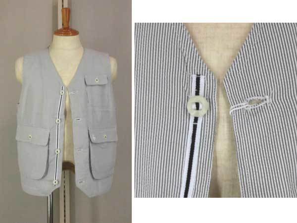 春物となります。 【特徴的な強撚糸(ちじみ加工)素材を使用】 強撚糸(ちじみ加工)素材を使用した清涼感のあるアウター・ベスト/ジレです。 強撚糸は撚り数の多い糸のこと。 生地にシャリ感やコシ、ちじみ形成を施しています。 【デザイン・ディティール・刺繍が決めて】 柄は細かいストライプのコードレーンとなります。 左胴ポケット天フタ部分にワンポイントで刺繍を施しています。 前合わせは4つボタン、 天フタ前あわせ部分にリボン素材をジョイントし、 ボタンをはずした時にアクセントとなります。 左胸にもポケットを付け、 全部でポケット3個となります。 【スタイル・シルエット・フィット感】 ゆったりサイズとなります。 清涼感のある軽くはおれるスポーツテイストのベストです。 尚、同色同素材のブルゾンも出品中です。 |