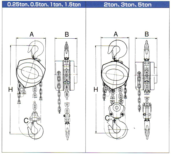 | 型式 | 揚量 (ton) | 揚程 (m) | 自重 (kg) | 手引力 (kg) | ロード チェーン の掛数 | チェーン寸法 |