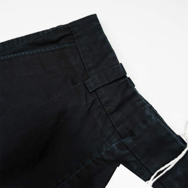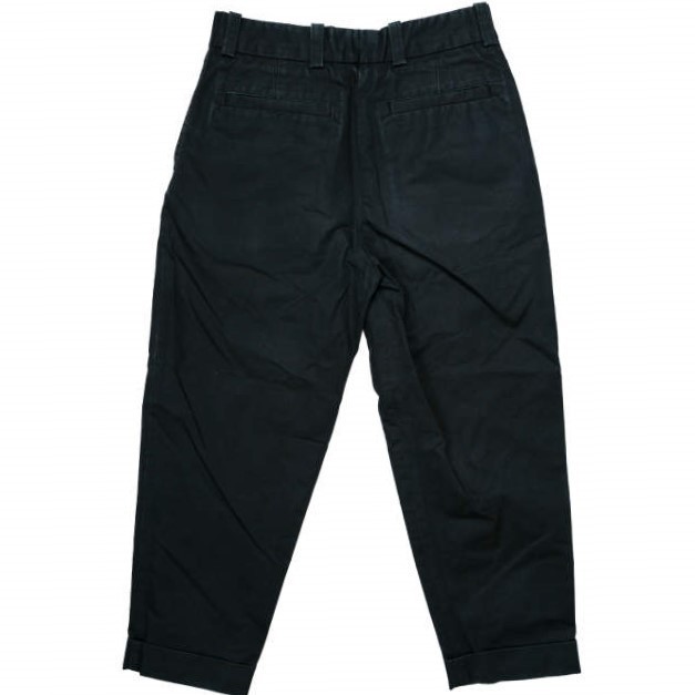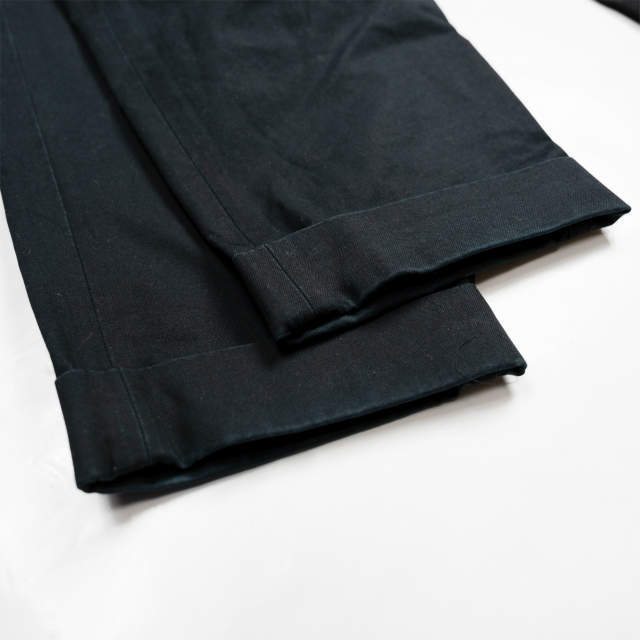 ゆったりとした腰い回りからテーパードの効いたシルエットで、裾はダブル仕上げ。