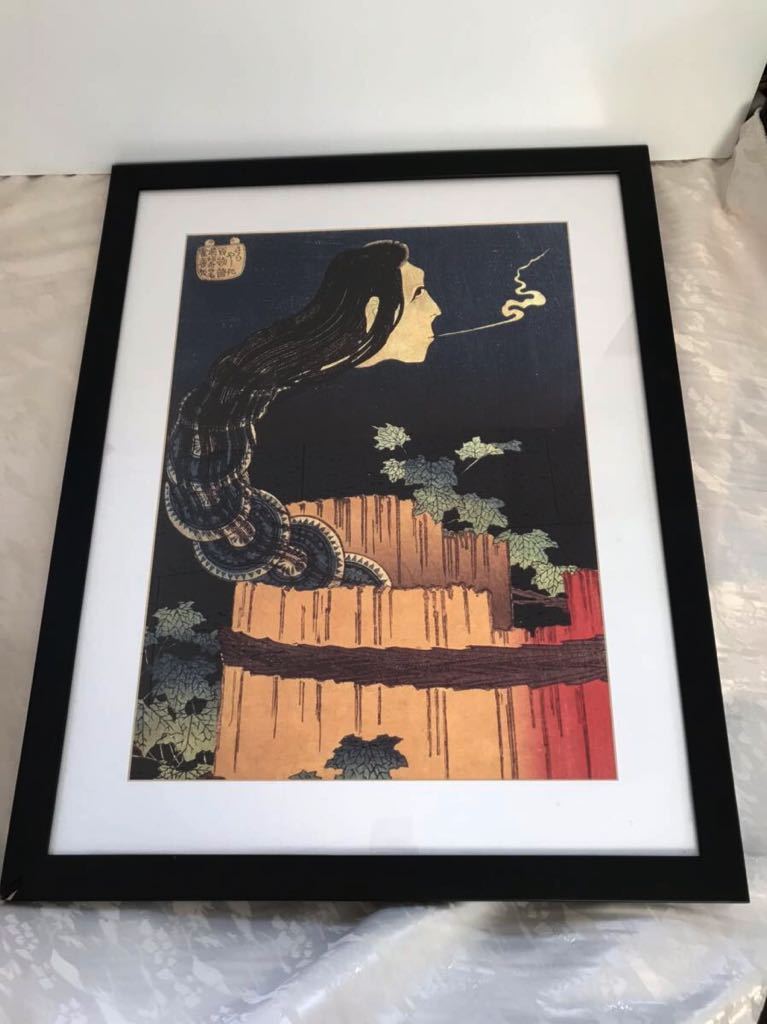☆有名な怪談「番町皿屋敷」のお菊の幽霊が井戸から出てくる場面を描いた作品『さらやしき』の稀少なポスターを額装してあるものになります。