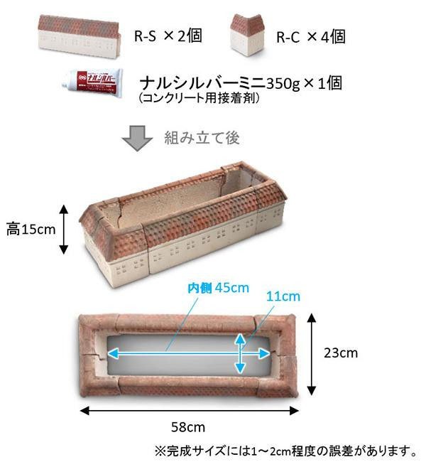 | ガーデンルーフと接着剤ナルシルバーミニのセットです。このセットで手軽に長方形の花壇を組み立てられます。地中海沿岸の古びた街並みをイメージしたちょっぴり可愛い花壇ブロック。玄関や庭園の足下を、優しく、ファンタジックな趣にしてくれるガーデンアイテムです。 ※裏面に装飾はありません。 ※凍結・融解を頻繁に繰り返す場所では凍害による割れ・ヒビが起きる場合がございます。凍害による補償は致しかねますのでご了承ください。 ※雨や水の当たる場所で使用される場合、時間経過と共にセメント分が染み出して白華(エフロレッセンス)と呼ばれる現象が起きます。 製品自体に悪影響はありません。この現象はレンガやコンクリート製品で一般的に起きますので、あらかじめご了承ください。 これを防止する場合は市販されている「白華防止剤」などをご利用頂くか、一度出てしまった場合はよく水洗いする等で対処できます。 ※北海道・沖縄・離島への配送は別途運賃が発生いたします。 |