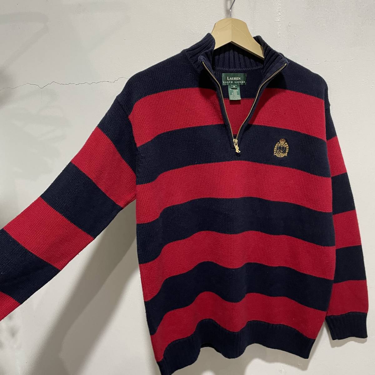 送料無料☆Ralph Lauren☆太ボーダーコットンセーター☆ハーフジップ☆赤ネイビー☆ニット☆S相当☆z20c