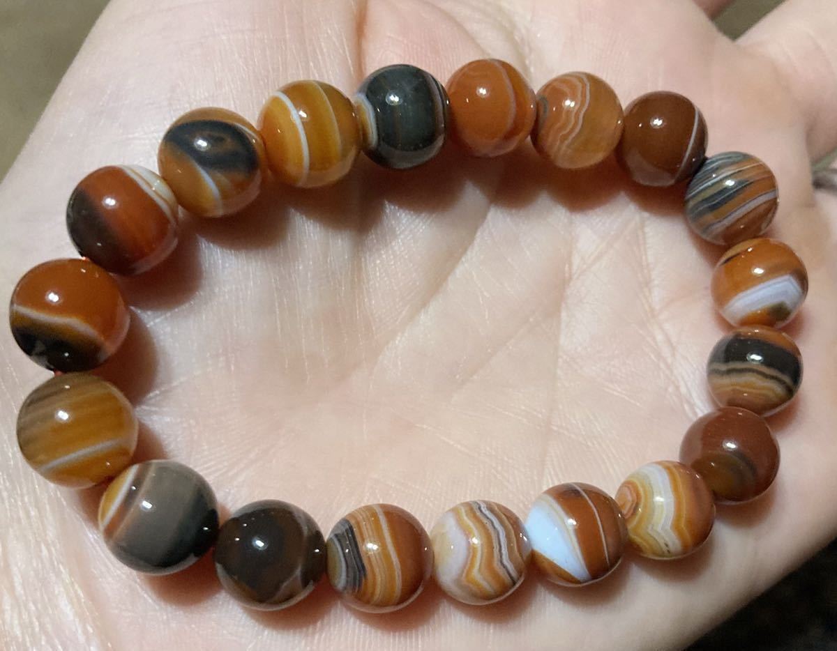 1cm玉連 ご覧の様に、色のグラデーション、縞模様が魅力的なサ-ドオニキスが連なっています。サードオニキスの模様は、同じ模様の物は一つもありません。このような模様を持つことから「個性」や「個を大切にする」石と言われており、個性を尊重したい、個性をもっと伸ばしていきたいという方におすすめの石です。