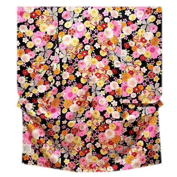 [和楽屋] ■「女の子 7歳~ 四つ身」 桜尽くし 黒色 煌びやかな金彩加工 地模様 可愛らしい 女児 七五三 お参り 四ッ身 長襦袢付き 着物■