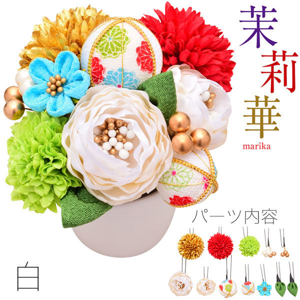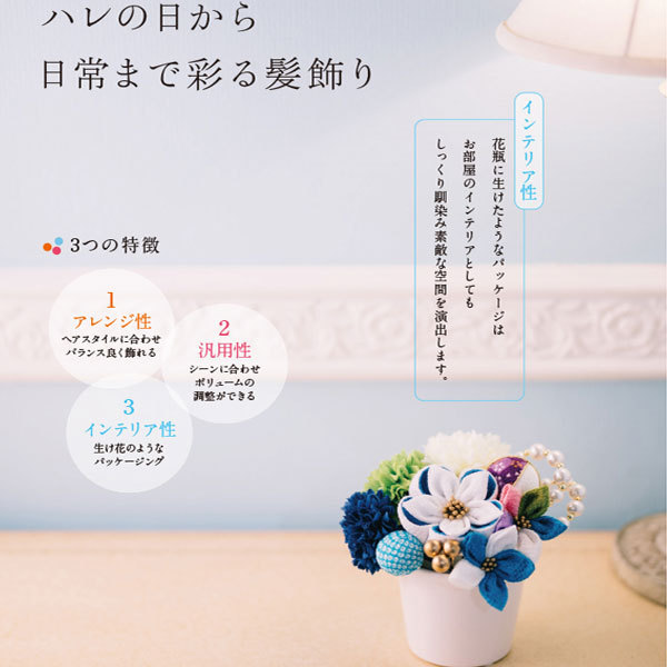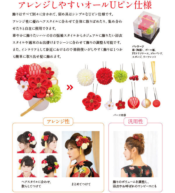 コロンとした丸みが可愛いラナンキュラスのお花です。ちりめん玉には和柄生地を合わせており古典のお着物にもよく合います。花一つ一つボリュームがありとても華やかに飾れます。・アレンジ性:ヘアスタイルに合わせバランス良く飾れる・汎用性:シーンに合わせボリュームの調整ができる・インテリア性:生花のようなパッケージング【アレンジしやすいオールUピン仕様】飾りはすべて別々に分かれて、留め具はシンプルなUピン仕様です。 アレンジ性に優れヘアスタイルに合わせて全体に散りばめたり、集め合わせたりと自在に使用できます。華やかに飾りたい晴れの日の振袖スタイルからカジュアルに飾りたい浴衣スタイルや週末のお出掛けまでシーンに合わせて飾りの調整も可能。インテリアとして身近におけるので普段使いがしやすく飾りは1つから簡単に取り出せ髪に飾れます。◆素材;ポリエステルレーヨン・綿 発泡スチロール・樹脂・鉄ル◆サイズ大花×1(花径6cm)小花×1(花径4cm)マム大×2(花径6cm)マム中×1(花径5cm)ちりめん玉大×1(玉径4cm)ちりめん玉中×1(玉径3cm)葉×2(縦幅3.5cm・横幅3cm)実玉5粒×1(玉径1cm)実玉3粒×1(玉径1cm)振袖・結婚式・成人式・パーティーなどに大活躍です。こちらの商品は取り寄せになりますので、出荷まで約1週間程お時間がかかります。在庫切れや納期未定の場合は、ご連絡差し上げます。