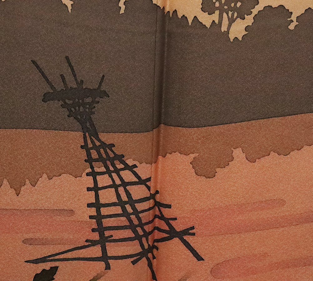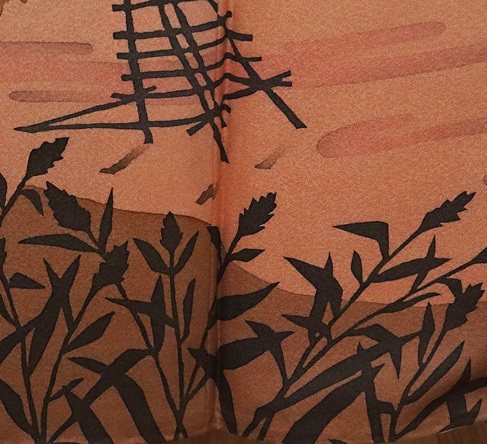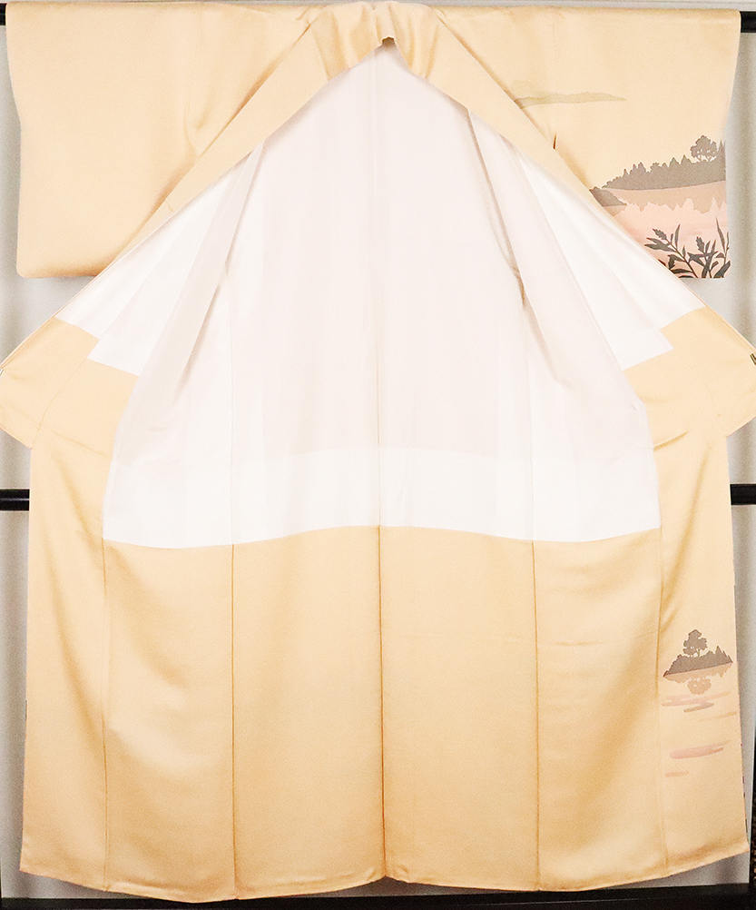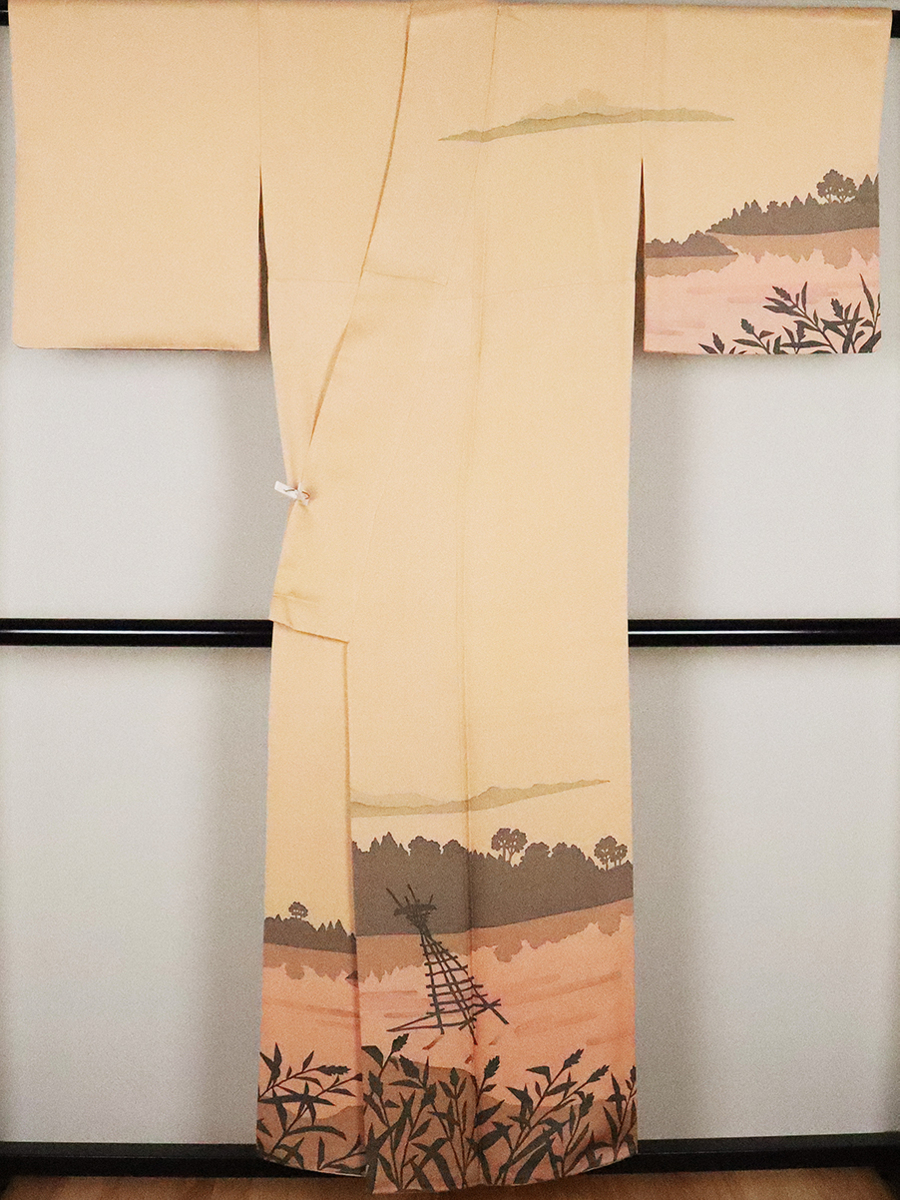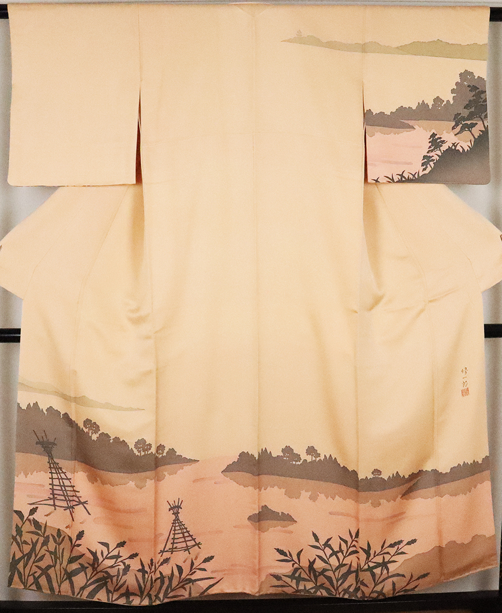 | 濱屋修一郎氏作 訪問着 袷 丹後縮緬 綸子生地 ベージュかかったオレンジ色地漁火風景 159 広襟 作家落款入り | |
