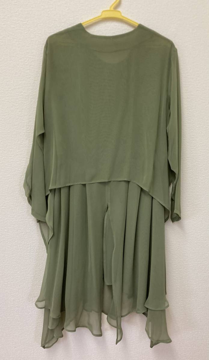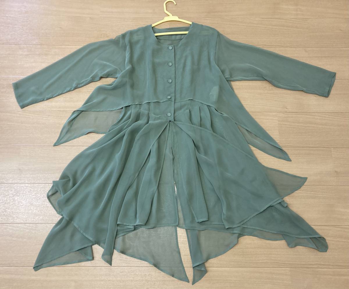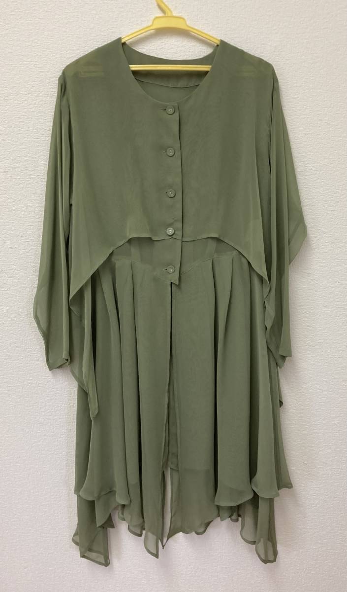 舞台衣装として一度着用しました。同時に出品している同じブランドの紺色ツーピースと重ねて着ました。購入価格は合わせて6万位です。ふわふわのシースルーなので色々な物に合わせて重ね着するとアレンジができると思います。1番長い所で着丈約103cm、スリットが深いのでパンツに合わせても綺麗だと思います。