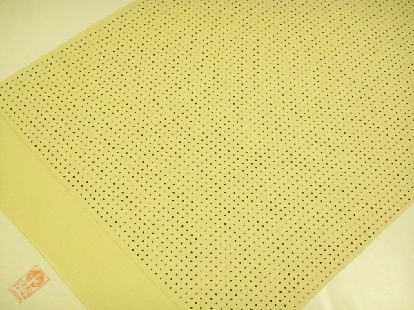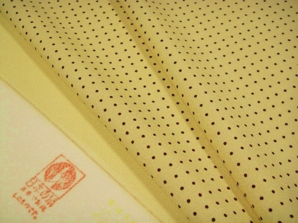 [丹後ちりめん製織] 正絹100% ヌキ糸(横糸)に水管撚糸を織り込んだ、 上質でシワに成り難く復元性の高い 低く細かいシボ凹凸の「変り三越ちりめん」生地を使用し、 上品な【淡黄色】(クリームイエロー色)を丁寧に手引き染めし、 黒茶色の粒(ドット)を8mm間隔に配した、 一見「角通し風」に染めた『行儀粒通し』江戸小紋です。 単衣でも御召しになって頂ける高級縮緬生地です。 お稽古事や、観劇・お食事会等、 お若い方から中~年配の方まで幅広く御召しになっていただけます。 生地巾:一尺二分(約38.5cm) 生地長:三丈六尺六寸強と充分あります。 【別途振込 ¥2,400-にて、 防水・防汚加工の「シルクガード加工」も承ります】 |