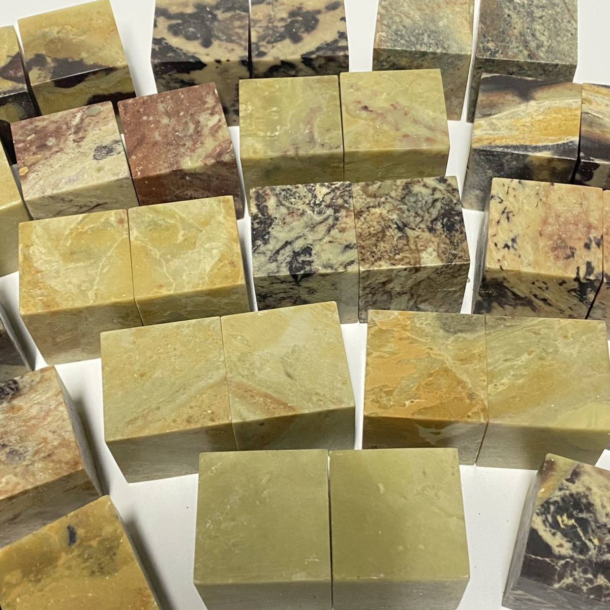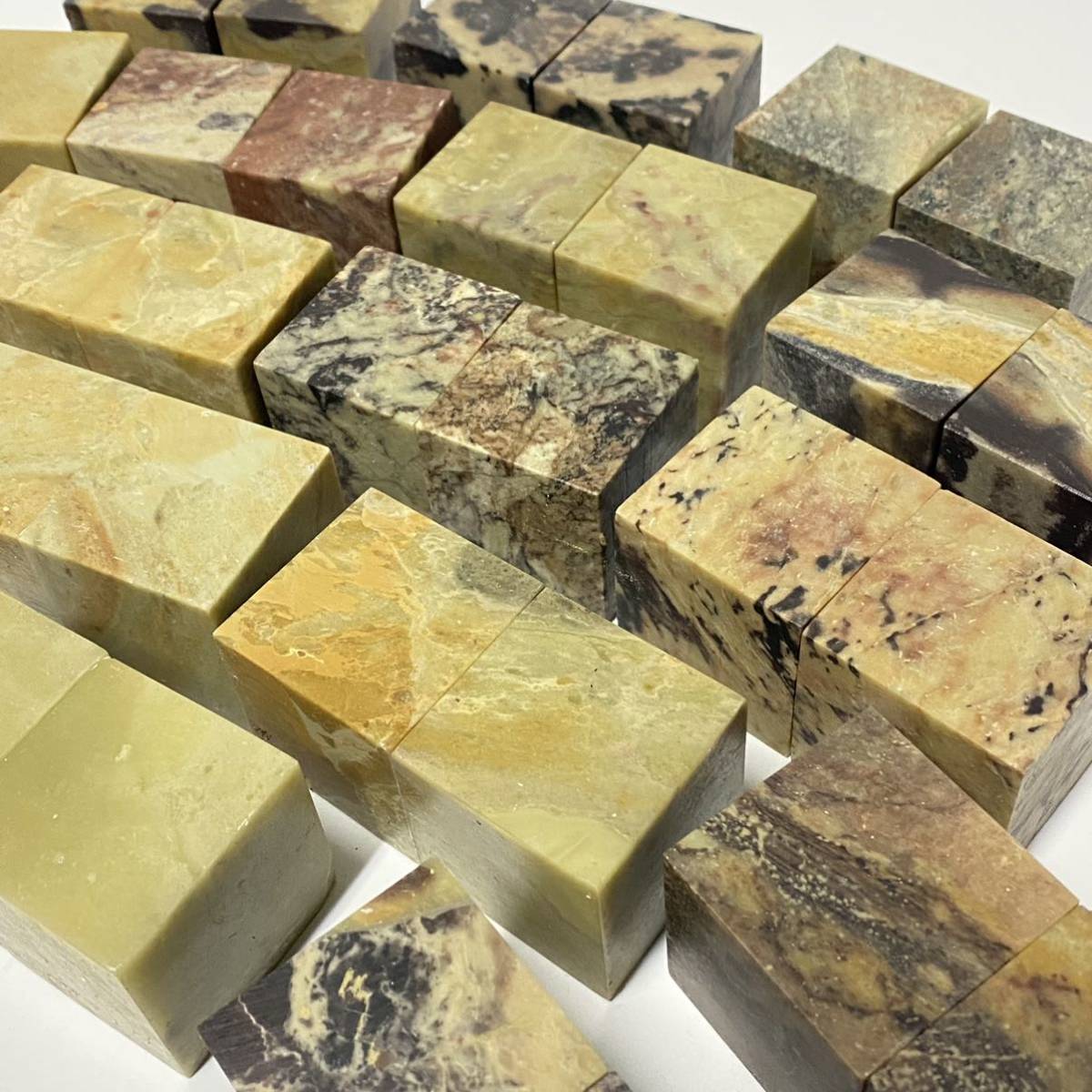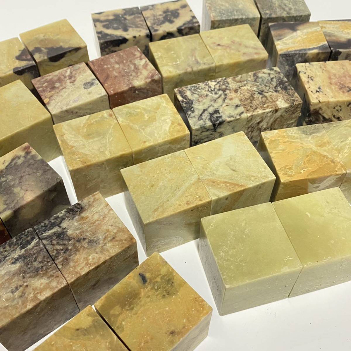 普通青田石章は青田石の中でも安価で見た目は色々な色が混ざる事もあります。硬い部分と柔らかい部分が混在する事もあります。