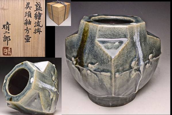 武内晴二郎 ★ 盛絵 流掛 呉須釉 方壺 ★ 共箱 ★ 希少 ★民芸陶 ★ 検 人間国宝 浜田庄司