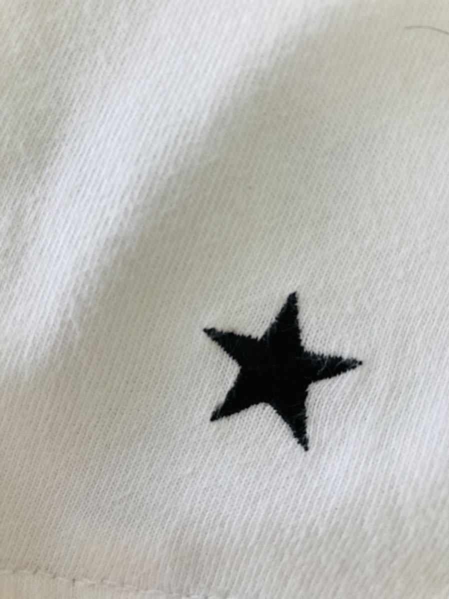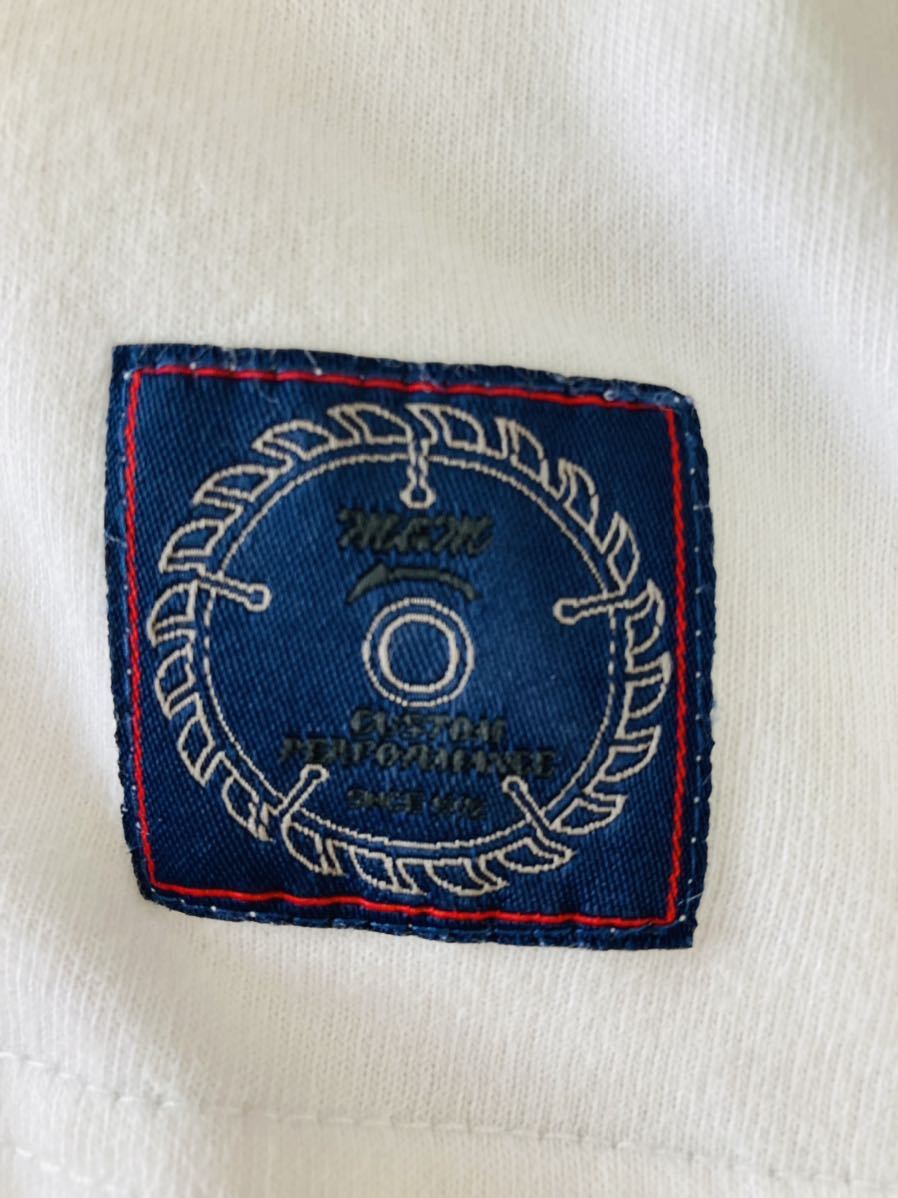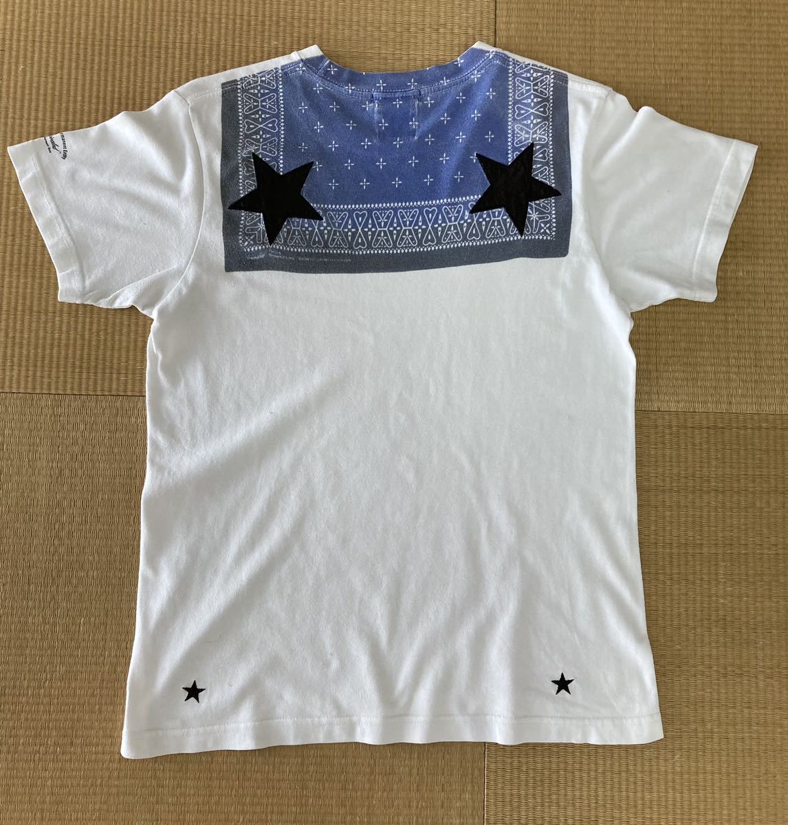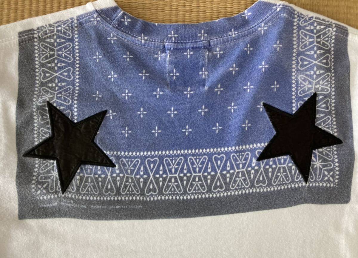 着丈約64センチ、胸囲約46センチ.肩約47センチ、袖約19センチ、ボディはホワイトです。ブルー系のバンダナが背中に転写プリントとスターの刺繍がされたデザインです。また袖にロゴ、両腰に星の刺繍、フロントにロゴ刺繍、フロントにワッペンと細かいとこ迄凝ったデザインです。