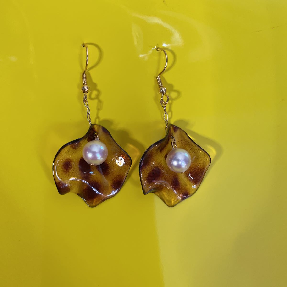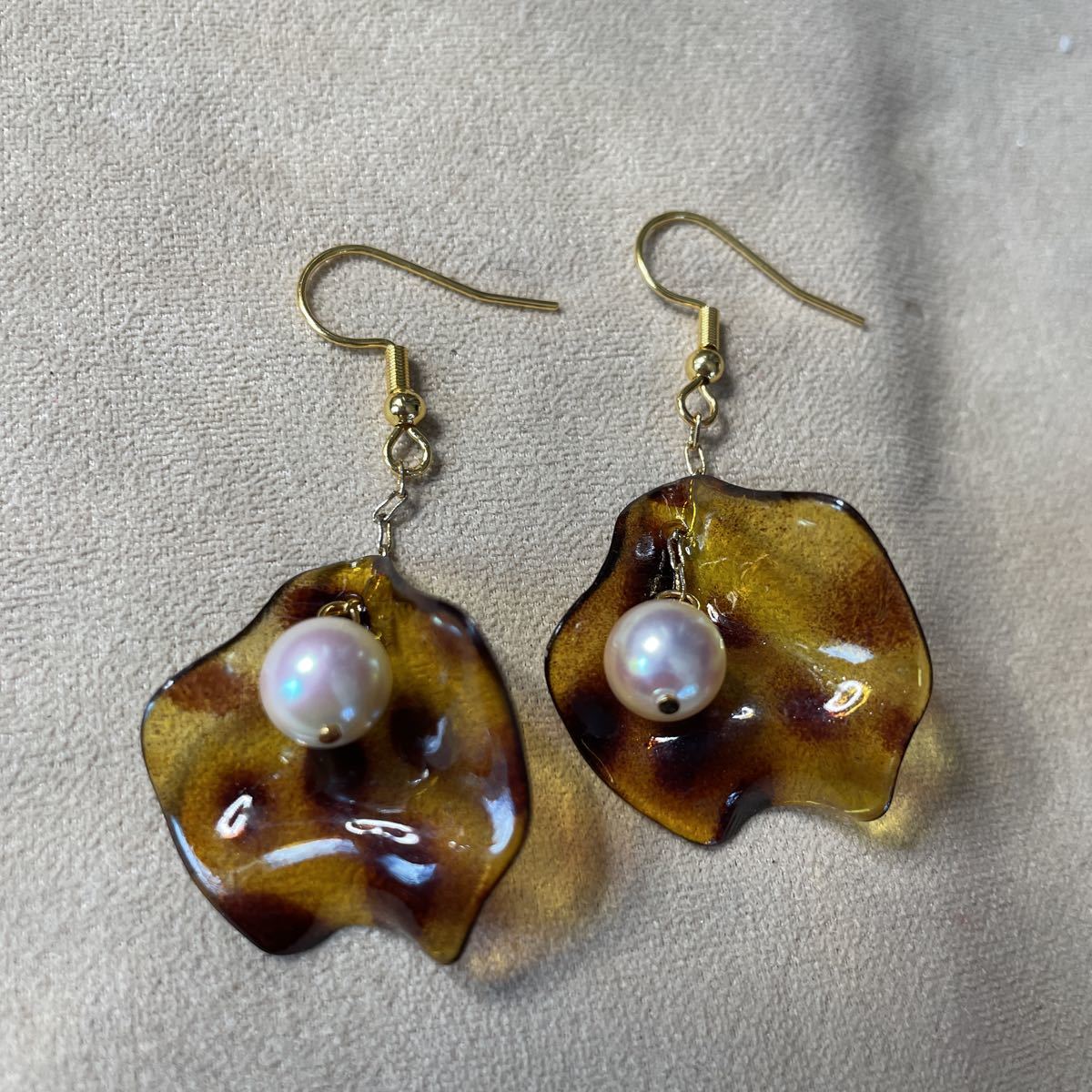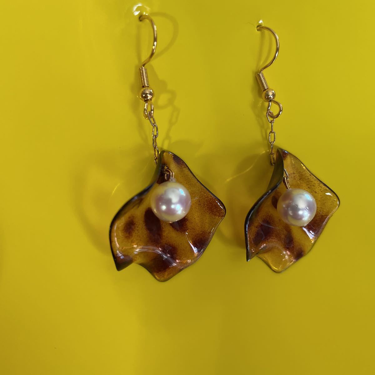秋らしいカラーのレオパート柄のリーフのような花びらのようなパーツと8ミリの貝パールを合わせました。フックはステンレスに金メッキしたのもを使用しております
